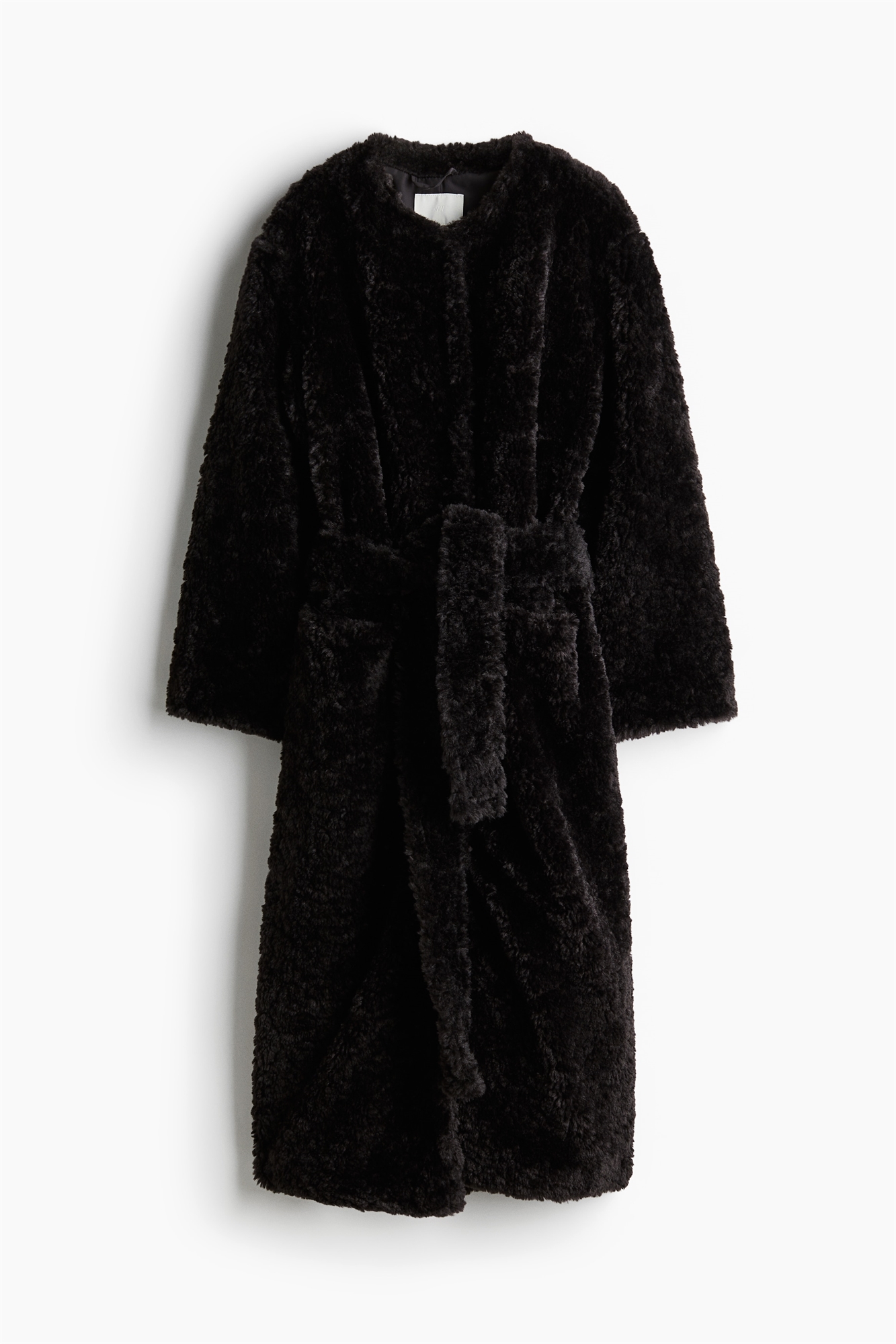 Пальто длиной до колена из пушистой ткани с круглым вырезом и потайными пуговицами спереди. Свободный крой с широким съемным поясом-завязкой на талии, открытыми карманами спереди и одним вентиляционным отверстием сзади. На подкладке.