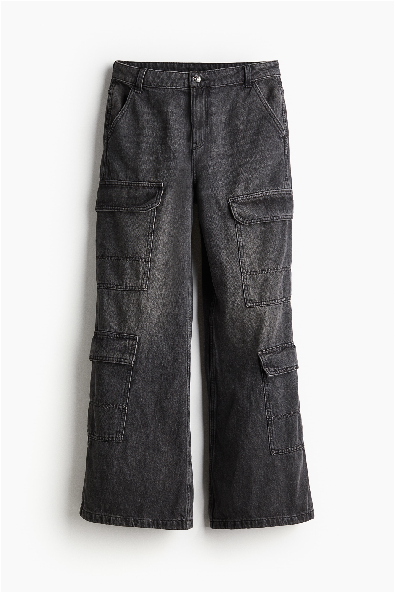 Брюки из хлопкового денима с ширинкой на молнии и пуговице, диагональными боковыми карманами и открытыми задними карманами. Широкие штанины с двумя накладными карманами.