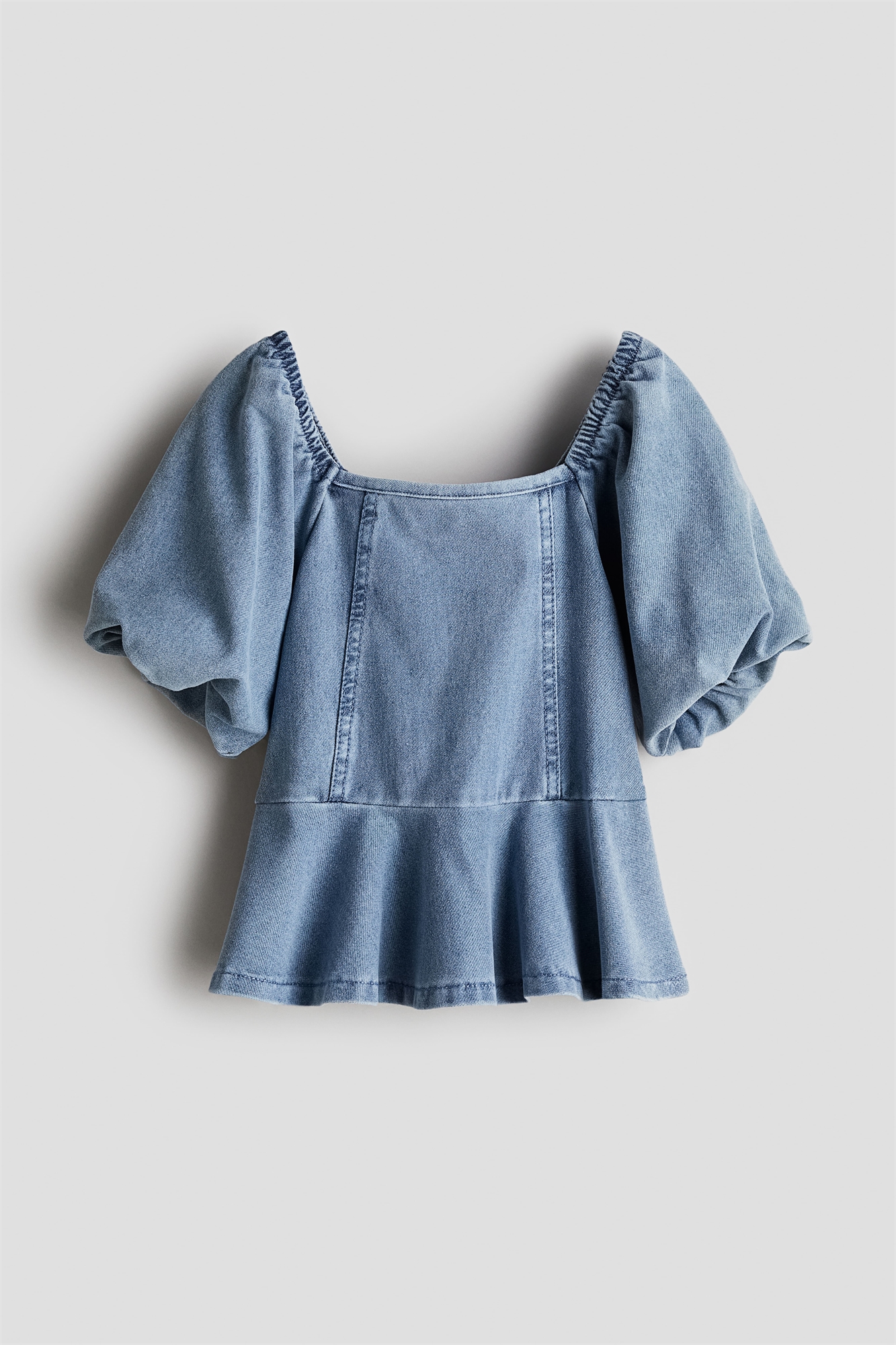 Блузка из стираного джерси джинсового цвета с расклешенным пеплумом. Квадратный вырез горловины с узкой эластичной резинкой на плечах и приталенные слоеные рукава покроя реглан.