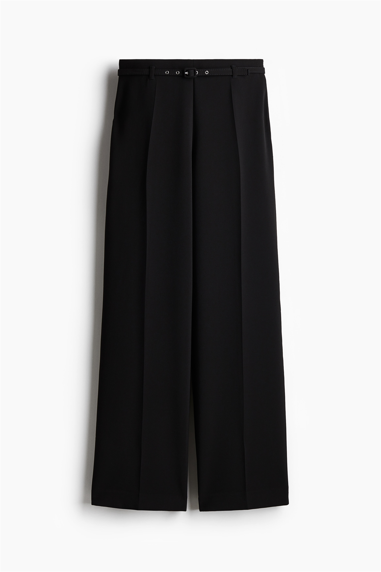 Брюки из саржи с высокой талией, потайной застежкой на молнию с одной стороны и узким поясом с прямоугольной пряжкой. Вытачки и накладные карманы сзади и широкие штанины со складками спереди и сзади.