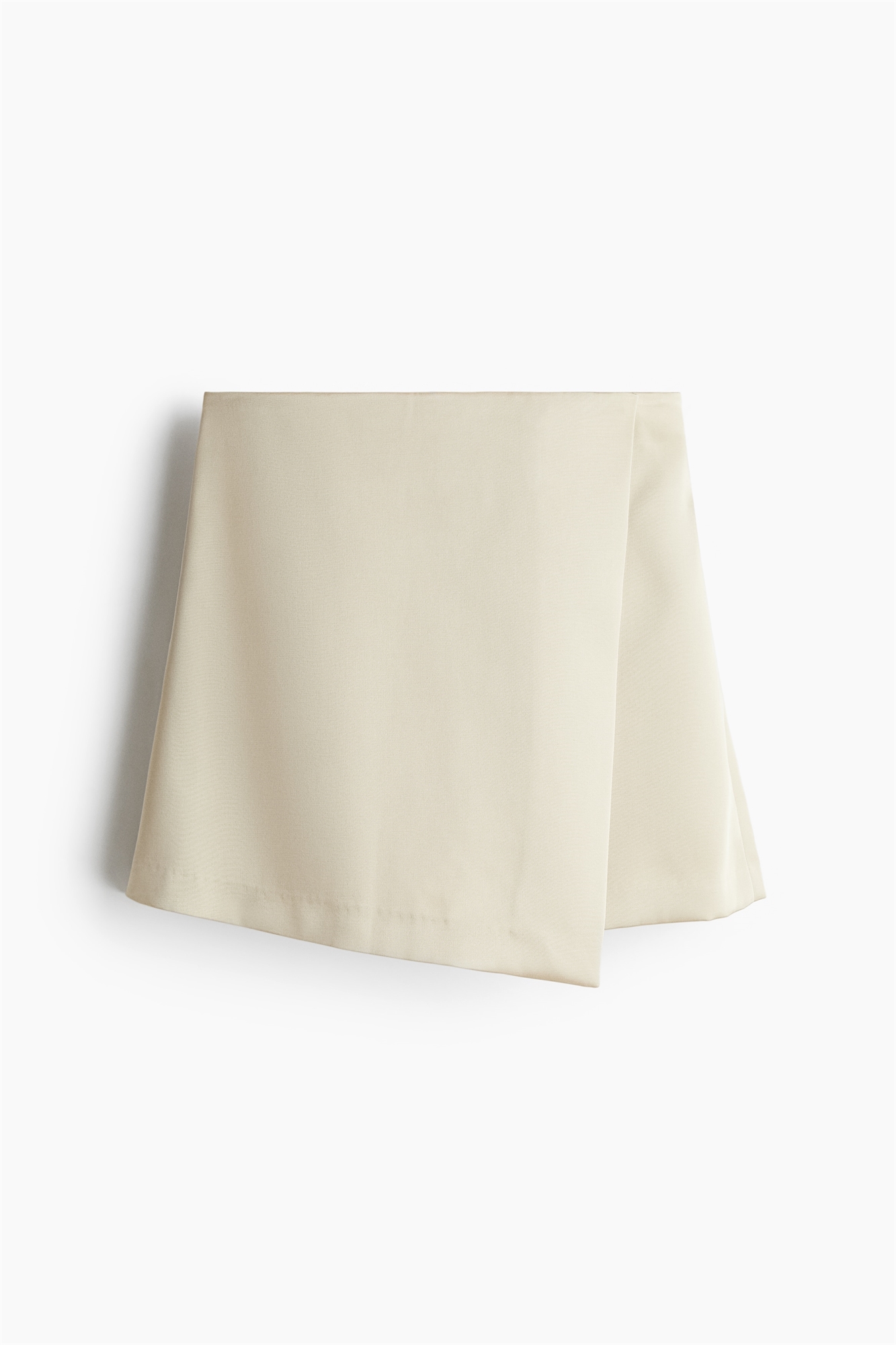 Шорты из тканого материала с высокой талией, скрытой эластичной резинкой и пришитой оберткой спереди. Скрытая застежка на молнию и пуговицу с одной стороны и фальшивые прорезные карманы сзади.