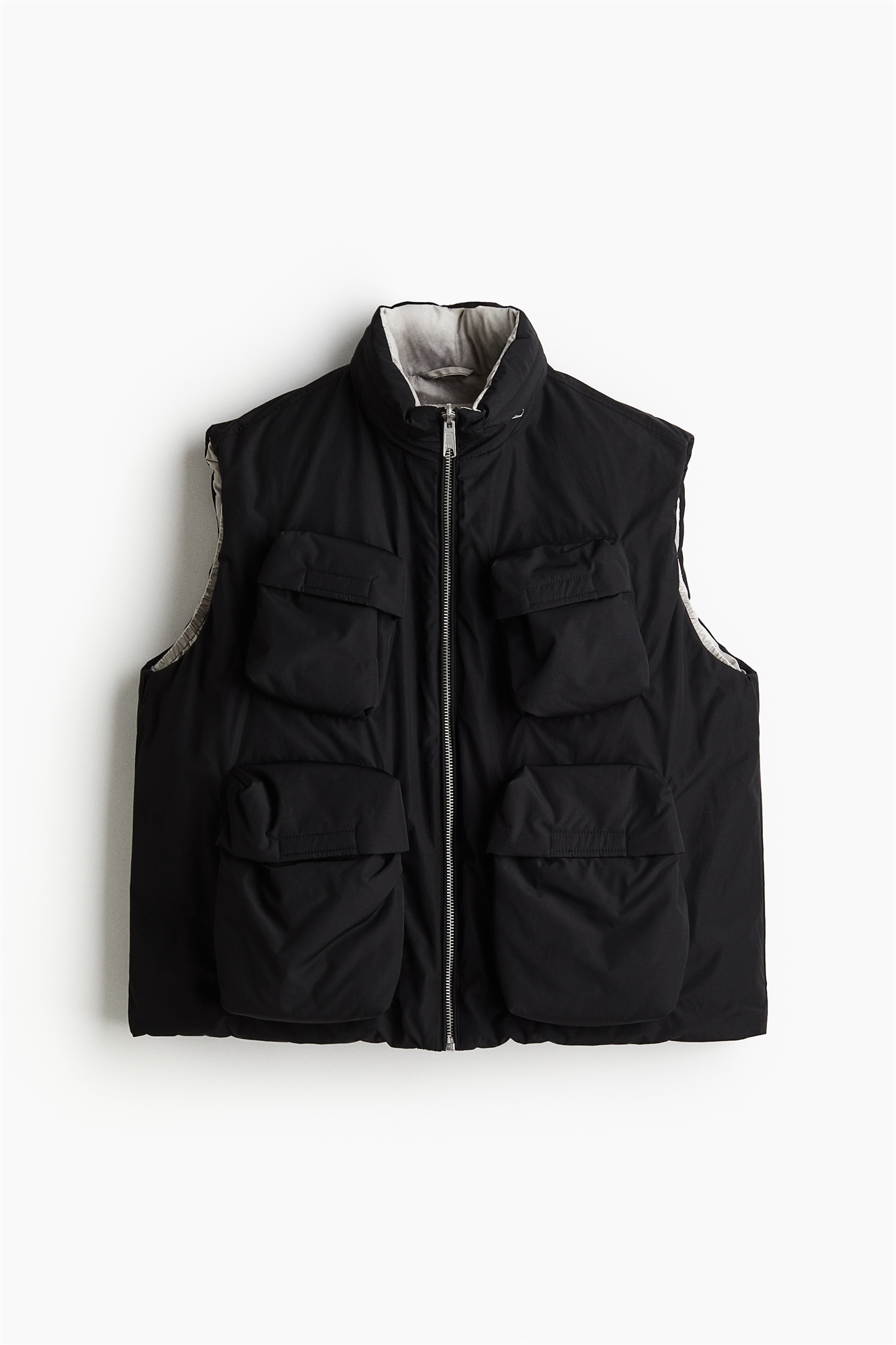 Двусторонняя пуховая жилетка из мягкой ткани с воротником-стойкой, застежкой-молнией спереди и эластичным шнурком по подолу. Однотонная сторона имеет капюшон, который можно свернуть и убрать в воротник, светоотражающую панель сзади и накладные карманы с крючками и петлями спереди. Узорчатая сторона имеет диагональные прорезные карманы спереди.