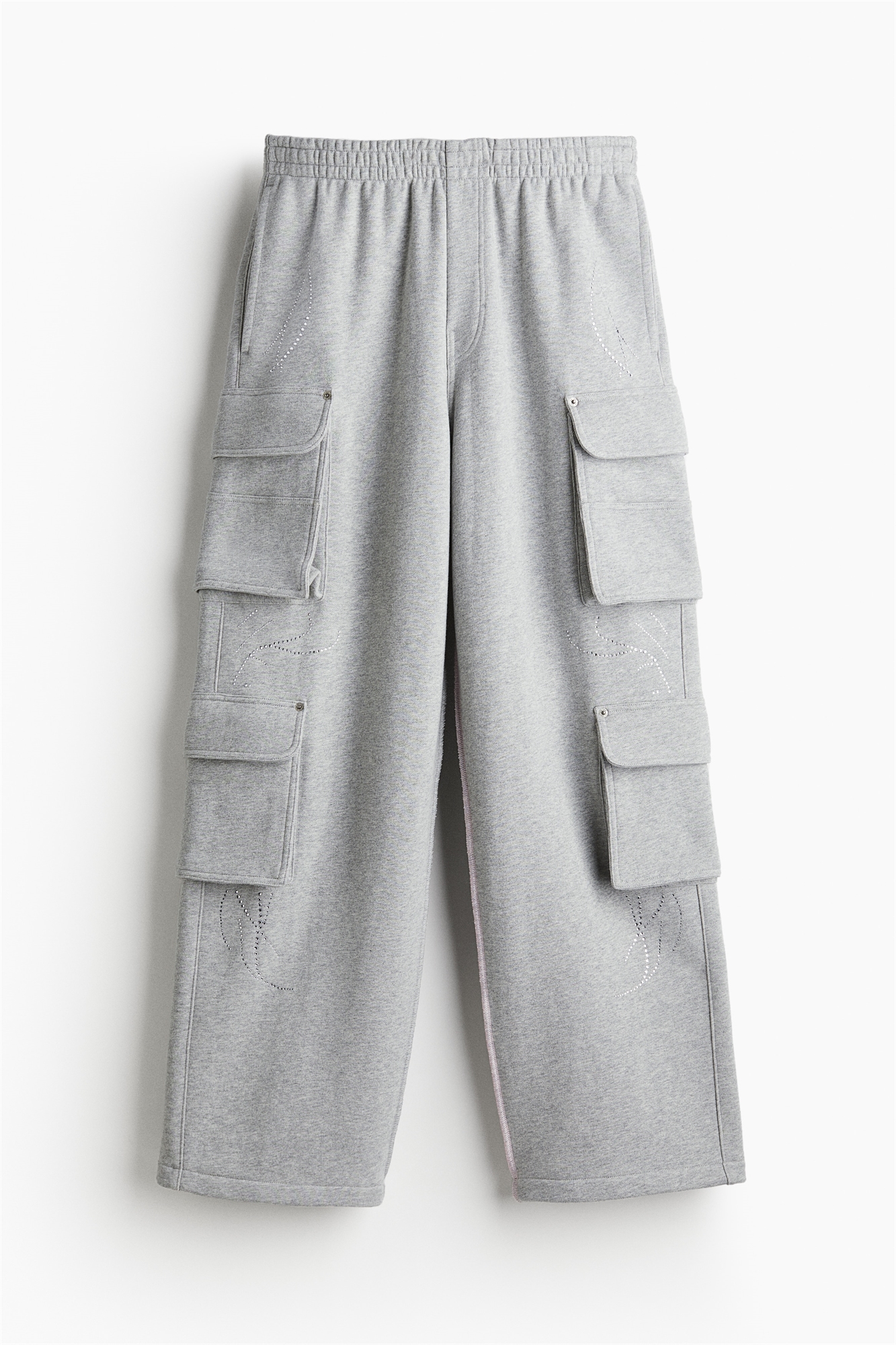 Мешковатые брюки из плотной хлопковой ткани с мягким начесом внутри. Эластичный пояс с завязками и фальшивая ширинка. Боковые карманы, карманы на ногах с клапаном и металлическими заклепками и задний карман с клапаном. Украшены сверкающими стразами и акцентным цветом на штанинах.