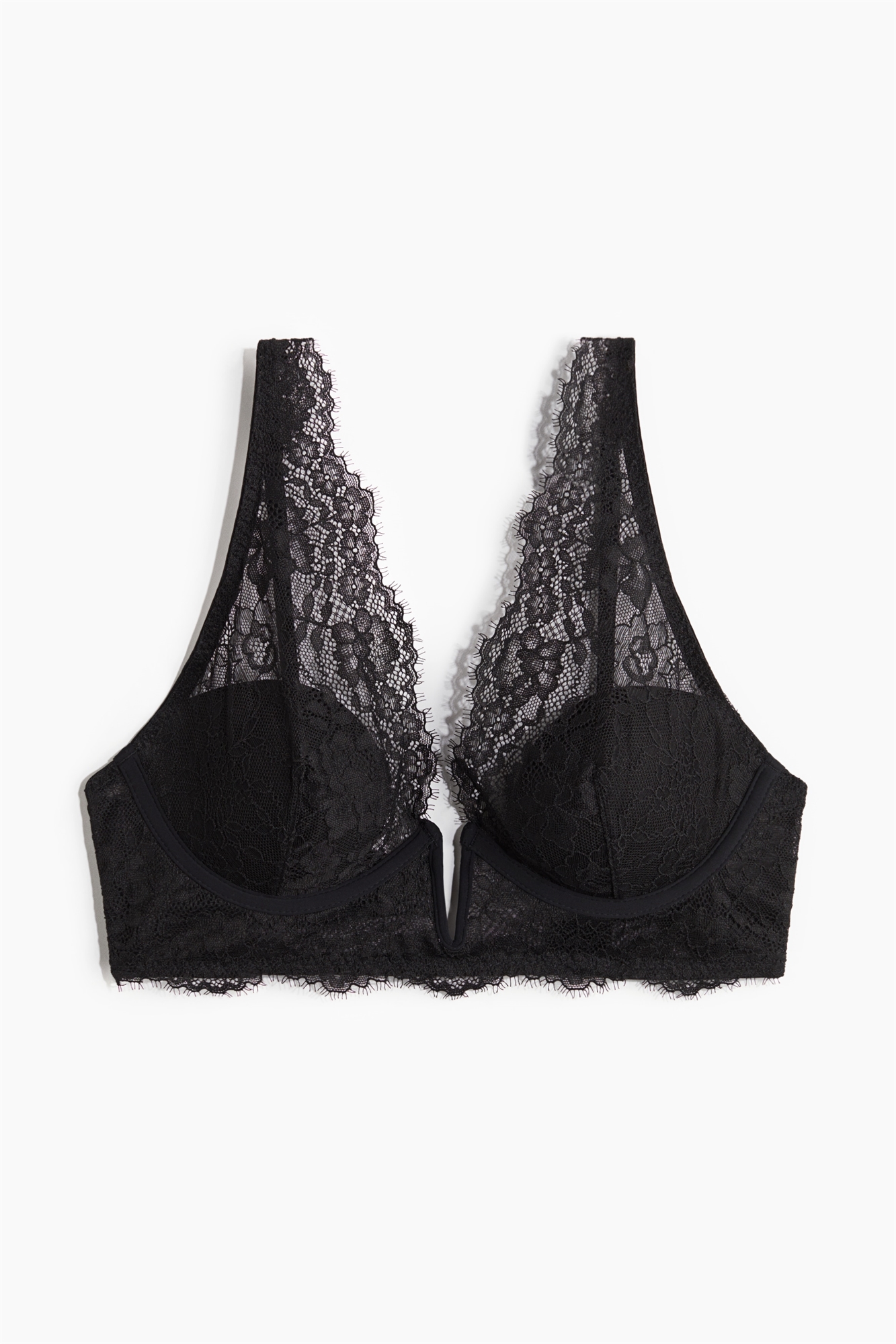 Бюстгальтер из кружева с глубоким вырезом, регулируемыми бретелями и мягкими чашечками с подкладкой, придающими форму бюсту и обеспечивающими хорошую поддержку. Застежка на крючки и глазки сзади.