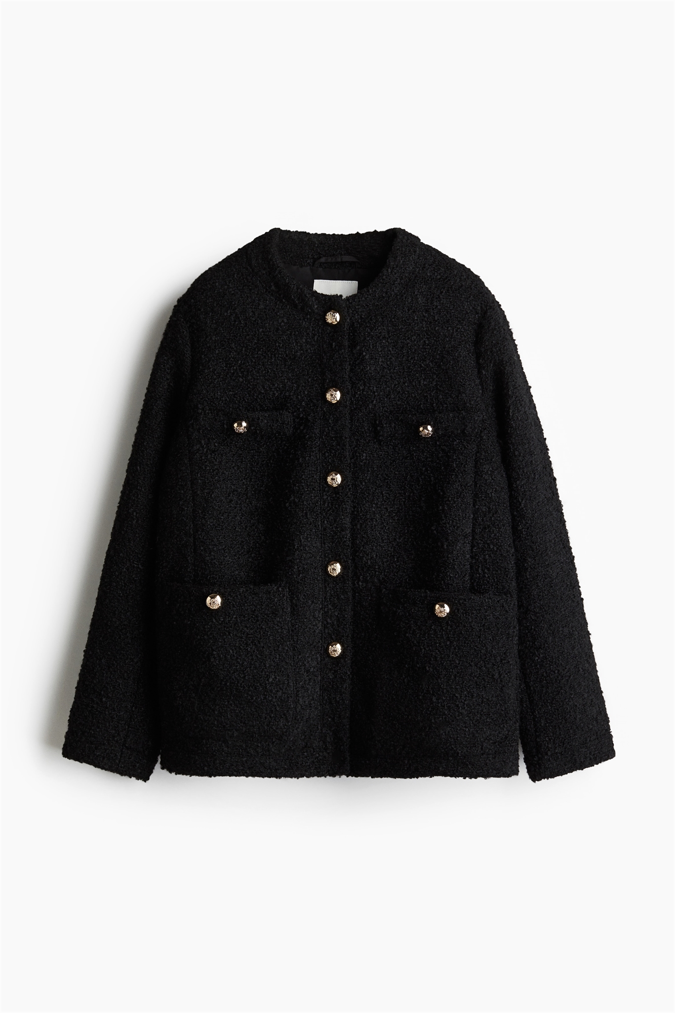 Жакет из букле с круглым вырезом и металлическими пуговицами спереди. Накладные карманы с пуговицей спереди и фальшивые нагрудные карманы с пуговицей. На подкладке.
