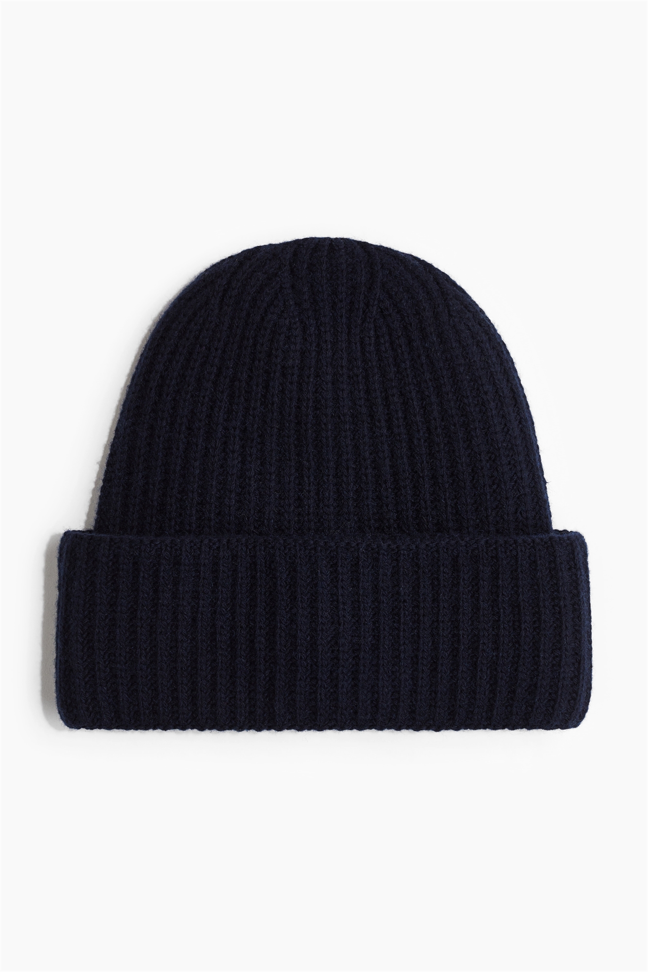 Шапка из согревающей шерстяной смеси с ребристой вязкой и подворотом на подоле.