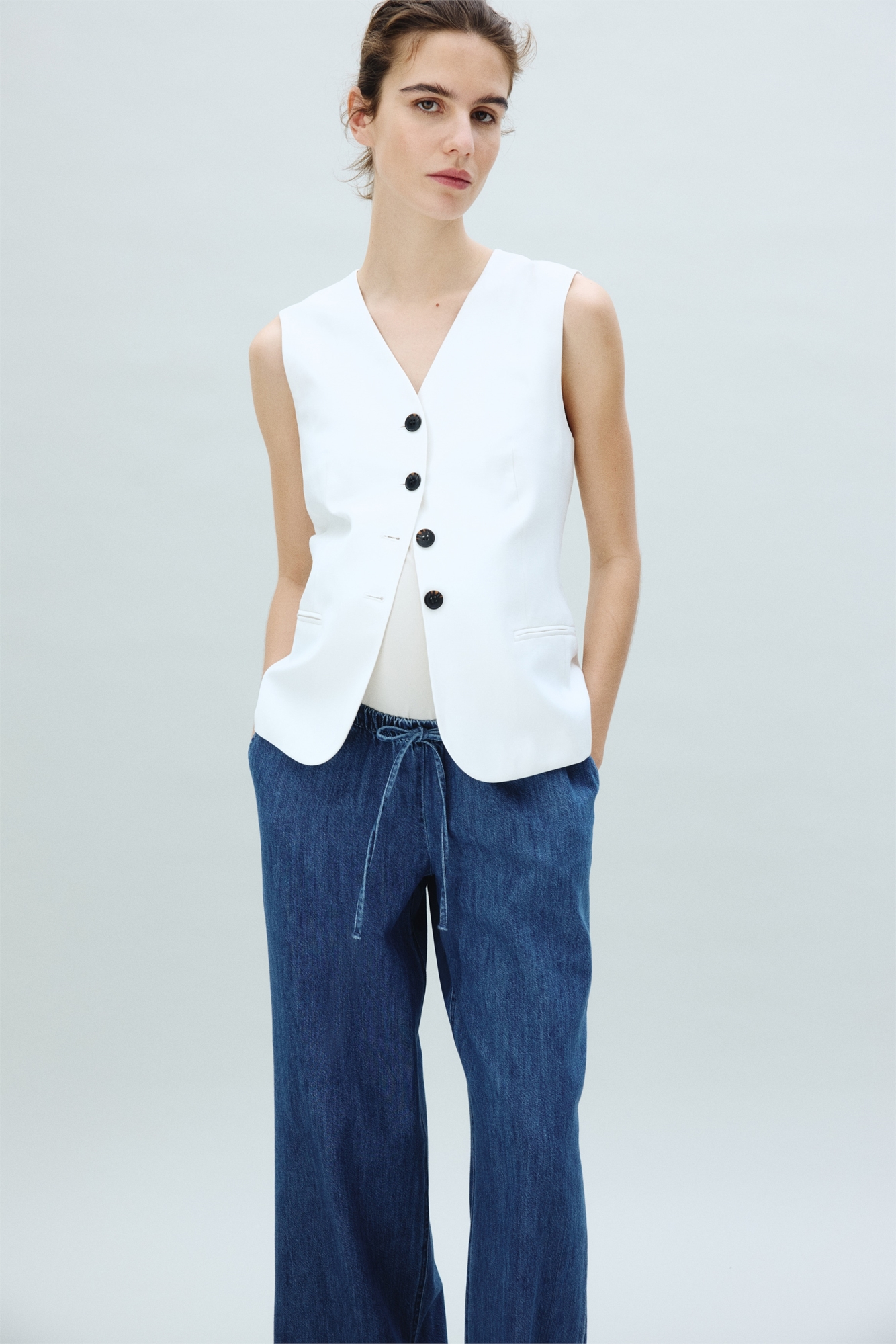 Свободные брюки из легкого денима из смеси хлопка и лиоцелла. Заниженная талия с эластичной отделкой и узким шнурком. Диагональные боковые карманы и широкие штанины.
