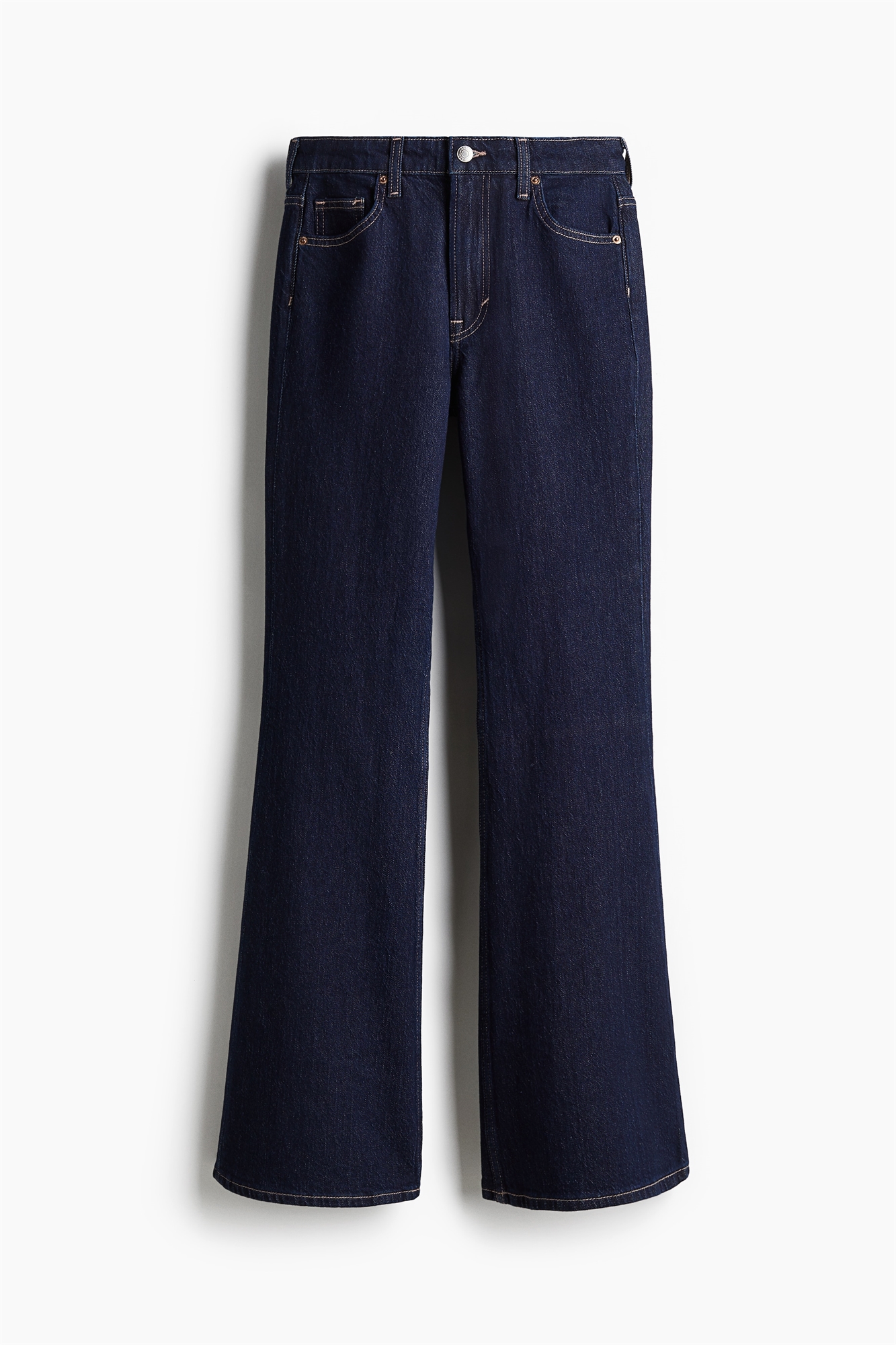 Джинсы с 5 карманами из денима с легким стретчем для комфорта. Расклешенные штанины с обычной посадкой от талии до бедра и расклешенным кроем от колена до подола. Высокая талия с ширинкой на молнии и пуговице. Регулярная длина, рассчитанная на то, чтобы доходить до верхней части стопы с небольшим запасом или вообще без запаса. Расклешенные, эластичные, сказочные.
