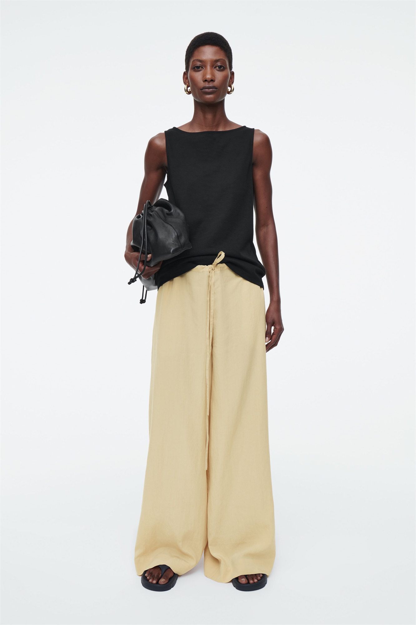 Эти брюки с широкими штанинами изготовлены из легкого материала TENCEL™ Lyocell и идеально подходят для теплой погоды. Они имеют утягивающий пояс и могут сочетаться с простой майкой в расслабленные дни. Свободный крой Стринги TENCEL™ - это бренд компании Lenzing AG. TENCEL™ Lyocell производится из возобновляемых источников древесины; 99% используемой воды и химикатов перерабатывается Верхний материал: 92% TENCEL™ Lyocell, 8% полиамид. Детали исключены/Машинная стирка Внутренняя длина ноги в размере 36 = 73 см/Модель носит размер 36