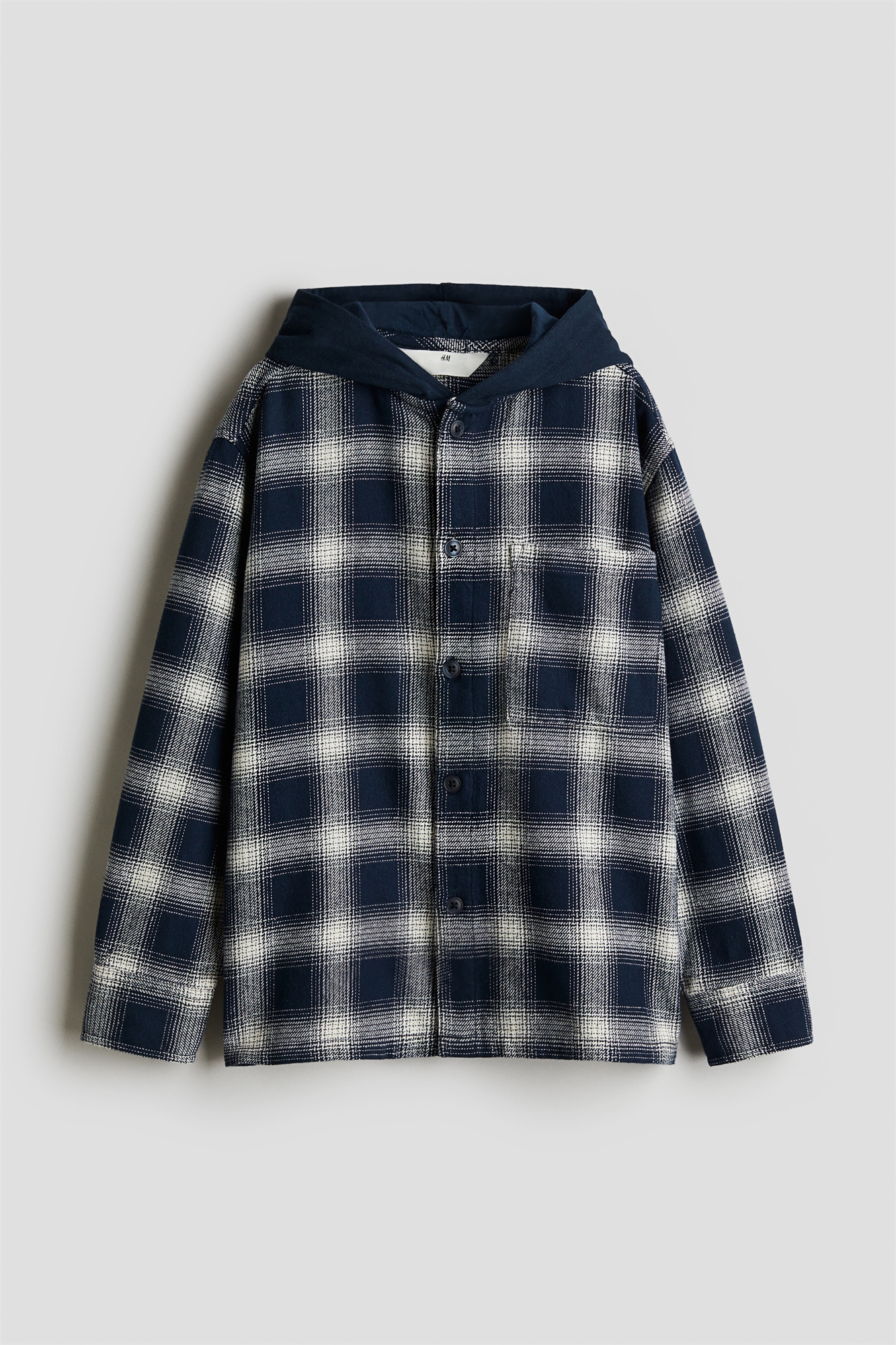 Рубашка из мягкой хлопковой фланели с капюшоном из джерси. Пуговицы спереди, накладной нагрудный карман, спущенные плечи и длинные рукава с манжетами на пуговицах.