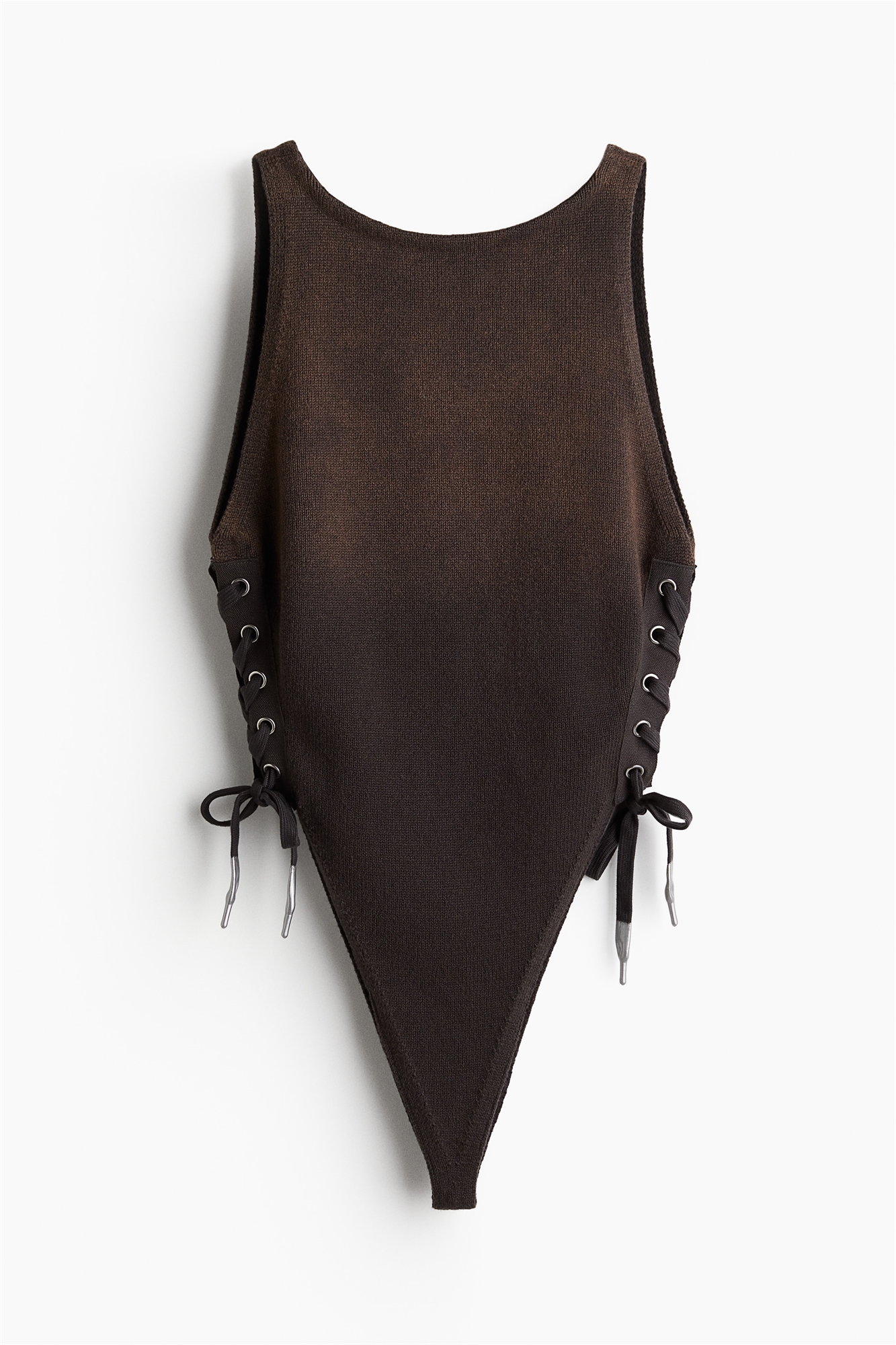 Боди-стринги без рукавов из мягкого тонкого трикотажа из смеси хлопка и шерсти. Узкий крой в верхней части, открытая спина, глубокие проймы и шнуровка по бокам. Ластовица на подкладке.