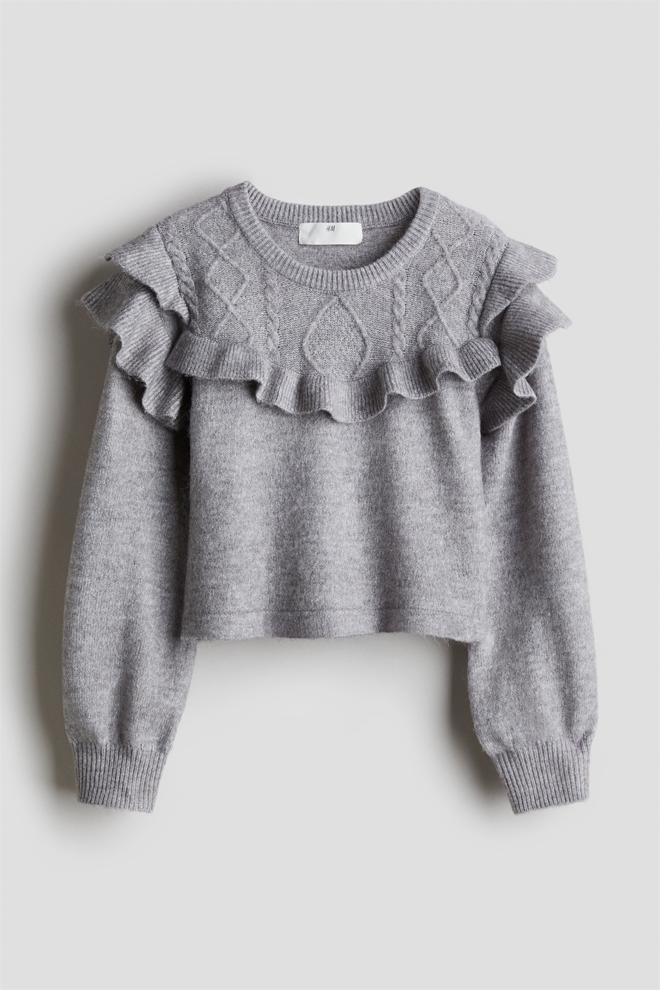 Короткий джемпер из мягкого тонкого трикотажа, спереди с узором в виде каната и оборками. Круглый ребристый вырез и длинные рукава с ребристыми манжетами.