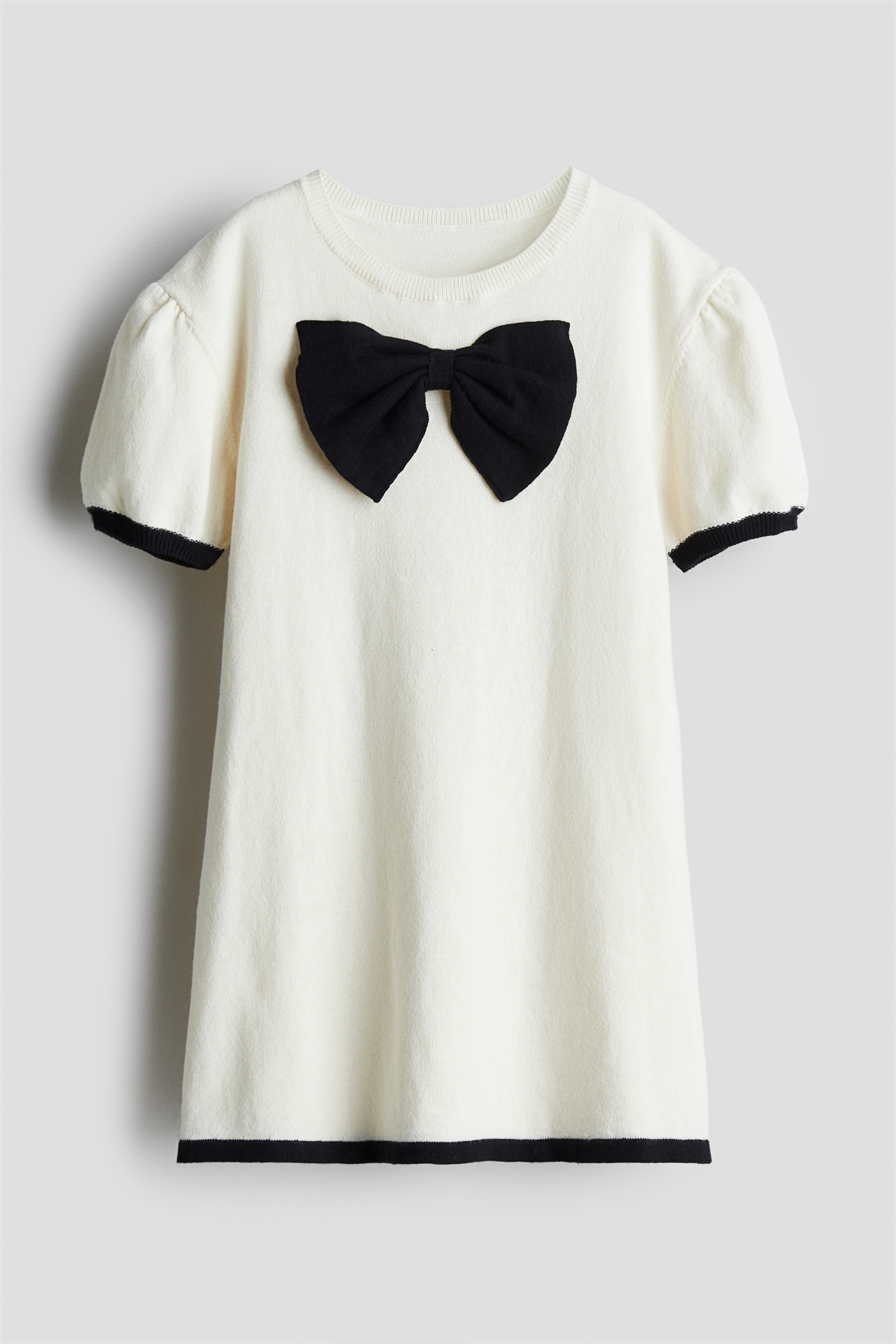 Платье А-линии из мягкого тонкого трикотажного хлопка с аппликацией спереди. Круглый вырез с ребристой отделкой, спущенные плечи и короткие пышные рукава.