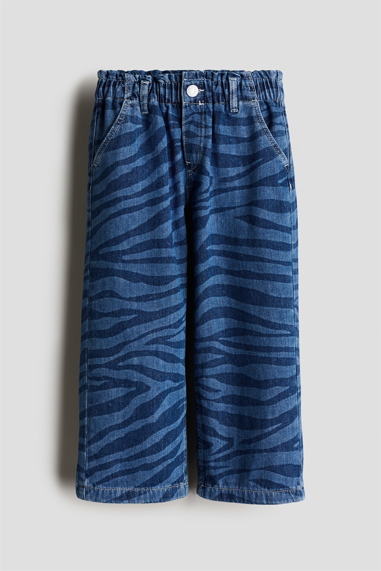 Широкие джинсы из хлопкового денима с принтом по всей длине и свободной посадкой по бедрам, ляжкам и штанинам. Регулируемый эластичный пояс с бумажным пакетом, фальшивая ширинка с кнопкой, диагональные боковые карманы и открытые задние карманы.