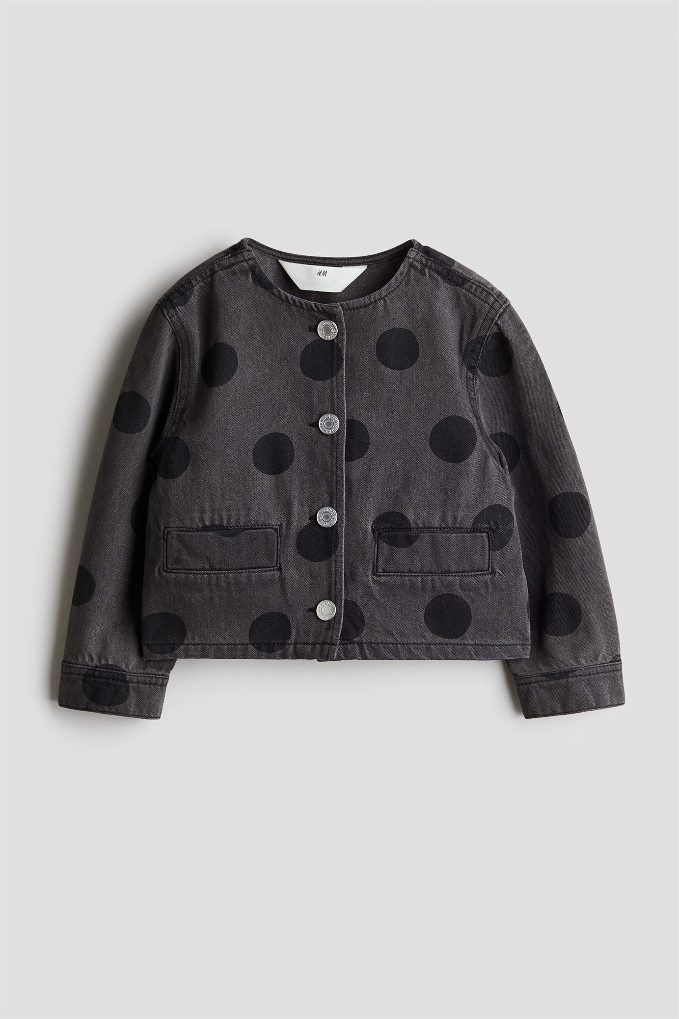 Куртка из принтованного хлопкового денима с круглым вырезом, застежками на кнопках спереди, втачными передними карманами и манжетами на пуговицах.