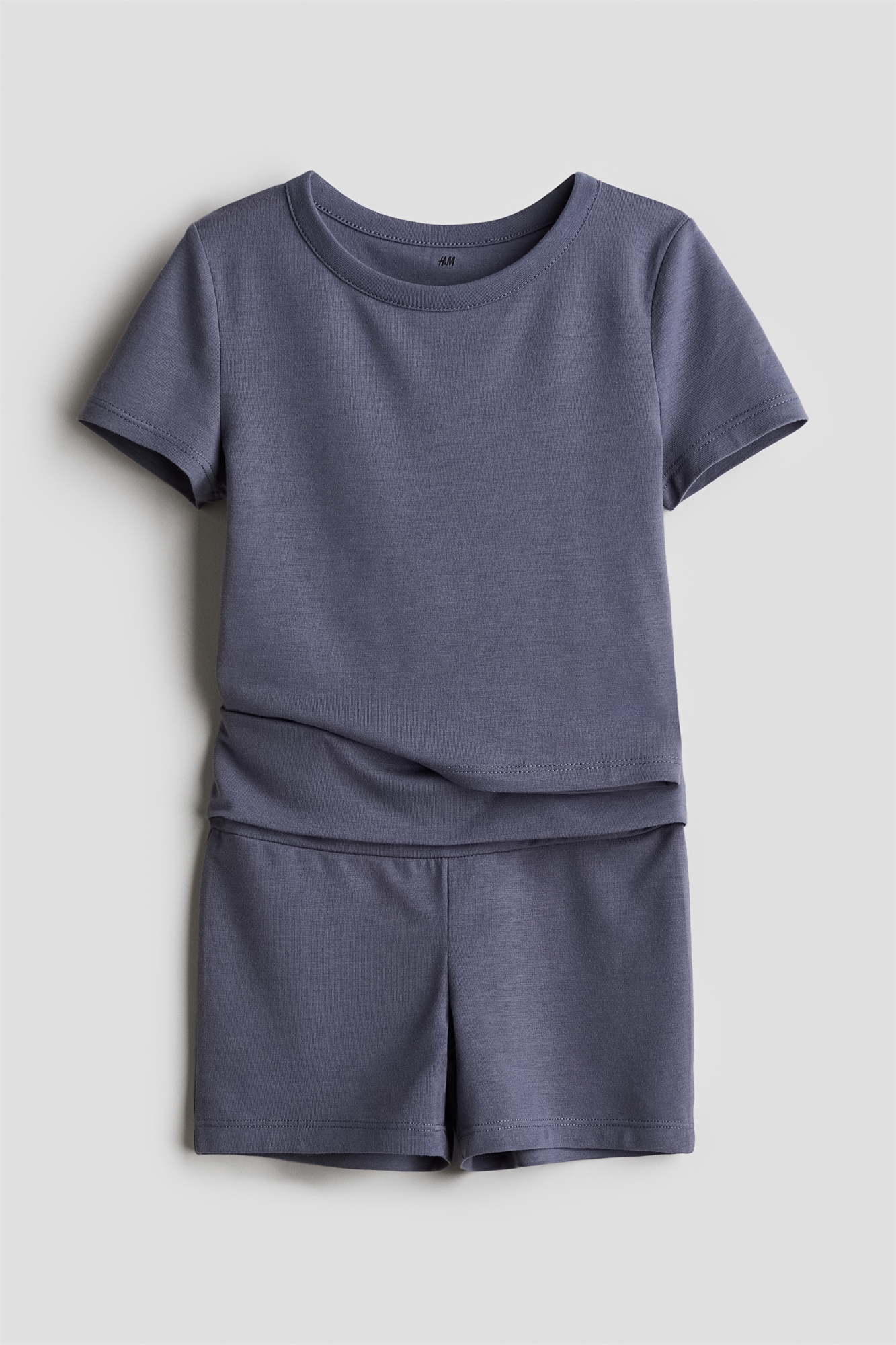 Комплект из топа и шорт из мягкого трикотажа. Топ с короткими рукавами и круглым вырезом с окантовкой и шорты с откидным поясом.