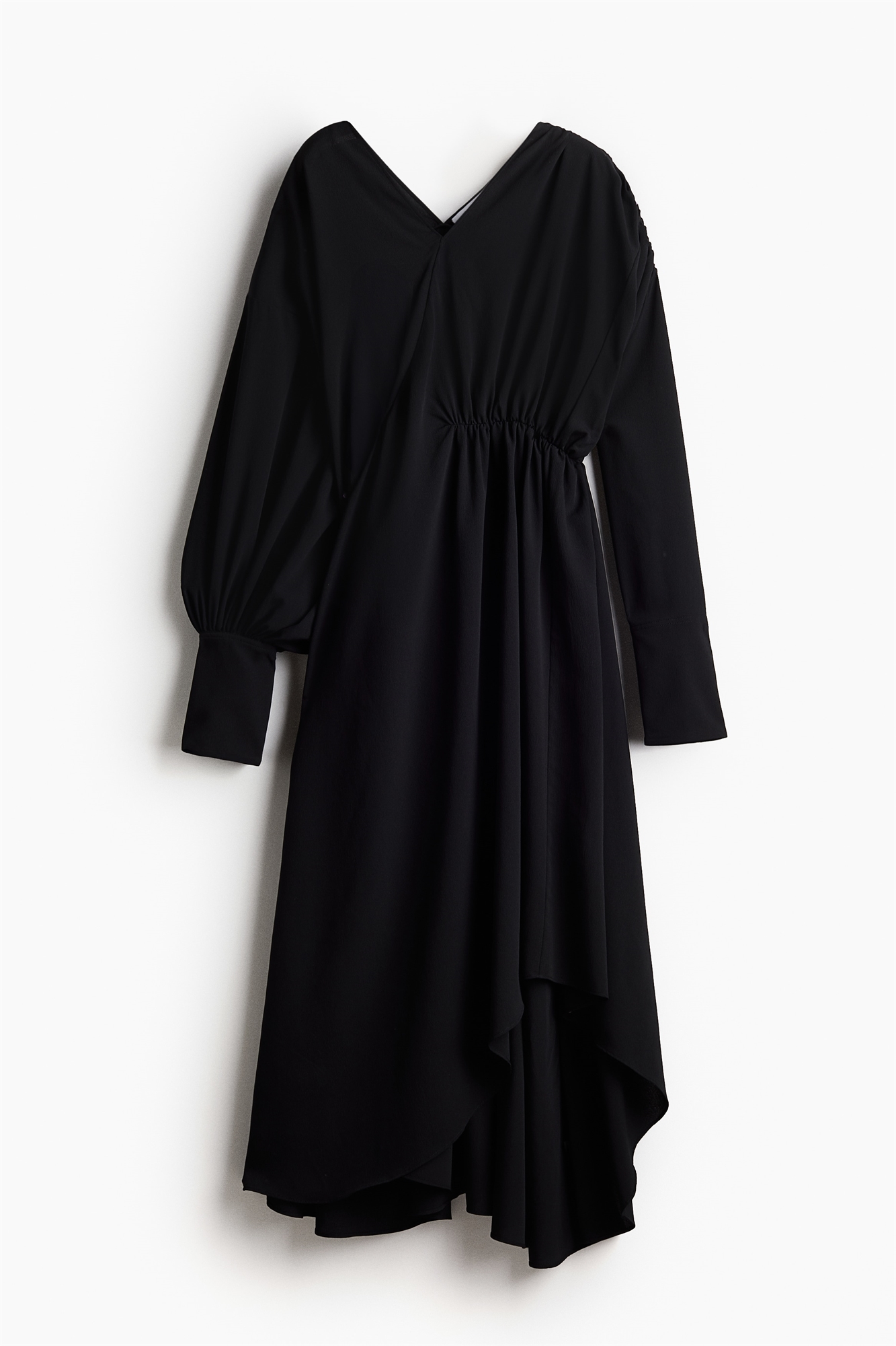 Коллекция Studio. Платье длиной до колена из крепа с V-образным вырезом спереди и сзади и длинными рукавами с широкими манжетами, на которых расположена изящная пуговица серебристого цвета неправильной формы. Один рукав в виде объемного баллона также помогает придать платью эффектный силуэт. Изогнутый, сборчатый шов на талии и сборчатая панель на груди с одной стороны, переходящая на плечо. Изящно ниспадающая юбка с асимметричным подолом. Без подкладки для легкости.