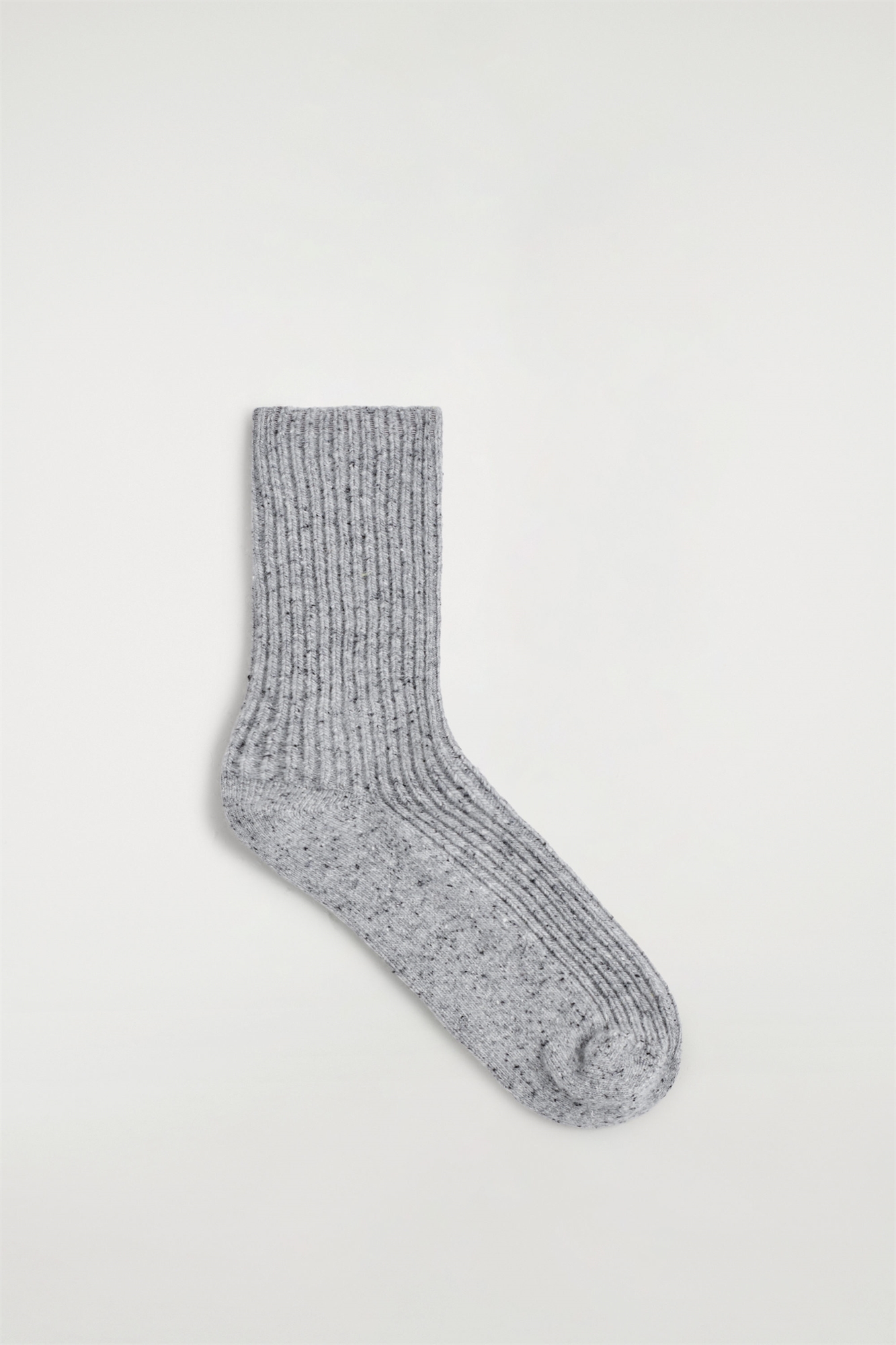 Эти ребристые носки изготовлены из переработанной шерсти и высококачественного тутового шелка, а также контрастных крапинок. В них вашим ногам будет хорошо и тепло даже в холодное время года. Переработанная шерсть изготавливается из отходов прядильного производства, остатков пряжи, обрезков от производства и одежды после потребления - так мы создаем новые фасоны без лишних трат Верхний материал: 47% полиамид, 22% переработанная шерсть, 21% вискоза, 9% шелк малбери, 1% эластан. Детали исключены/машинная стирка