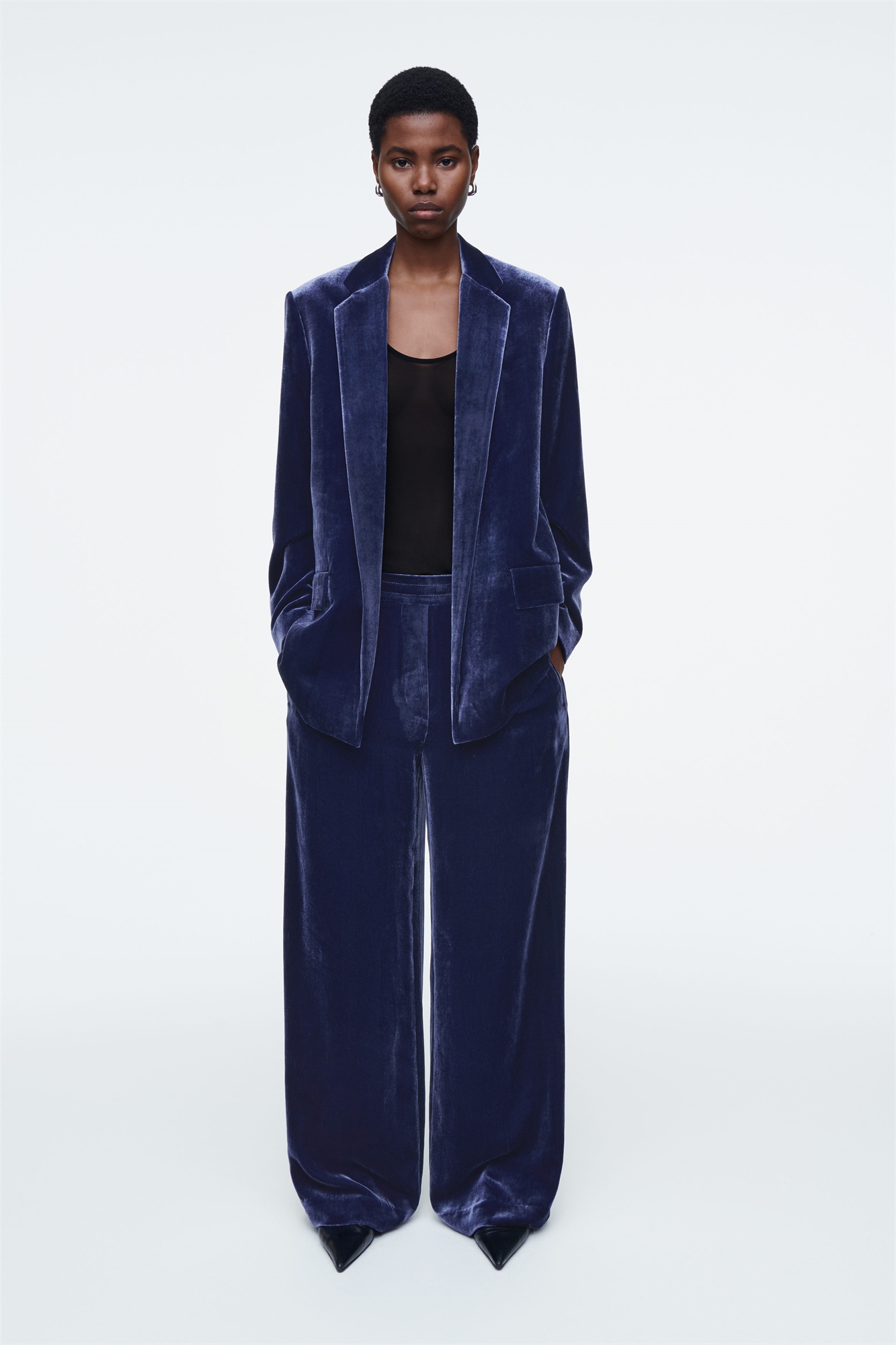 Команда женской одежды исследует богатую тактильность бархата в предстоящем сезоне. Эти эластичные брюки с прямыми ногами сшиты из плюшевой смеси шелка и шелковицы, которая дополняет ювелирный сапфировый оттенок. Сочетайте их с подходящей рубашкой или блейзером. Регулярный крой Карманы в боковых швах Материал: 80% вискоза, 20% шелк малбери. Без учета отделки / Сухая чистка Внутренняя длина ноги размера EU 36 составляет 75 см / Модель носит размер EU 36