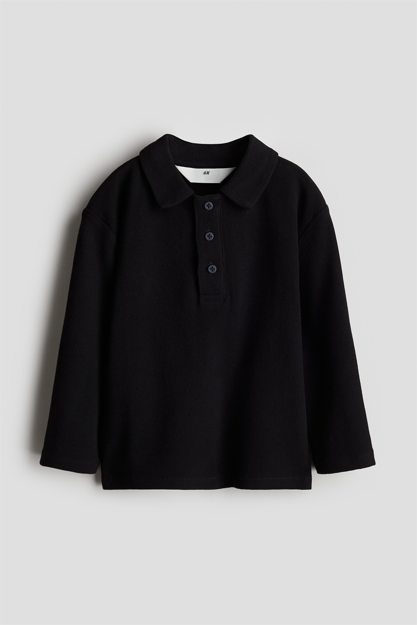 Рубашка-поло с длинными рукавами из вафельного хлопкового джерси с воротником, застежкой на пуговицы и спущенными плечами.