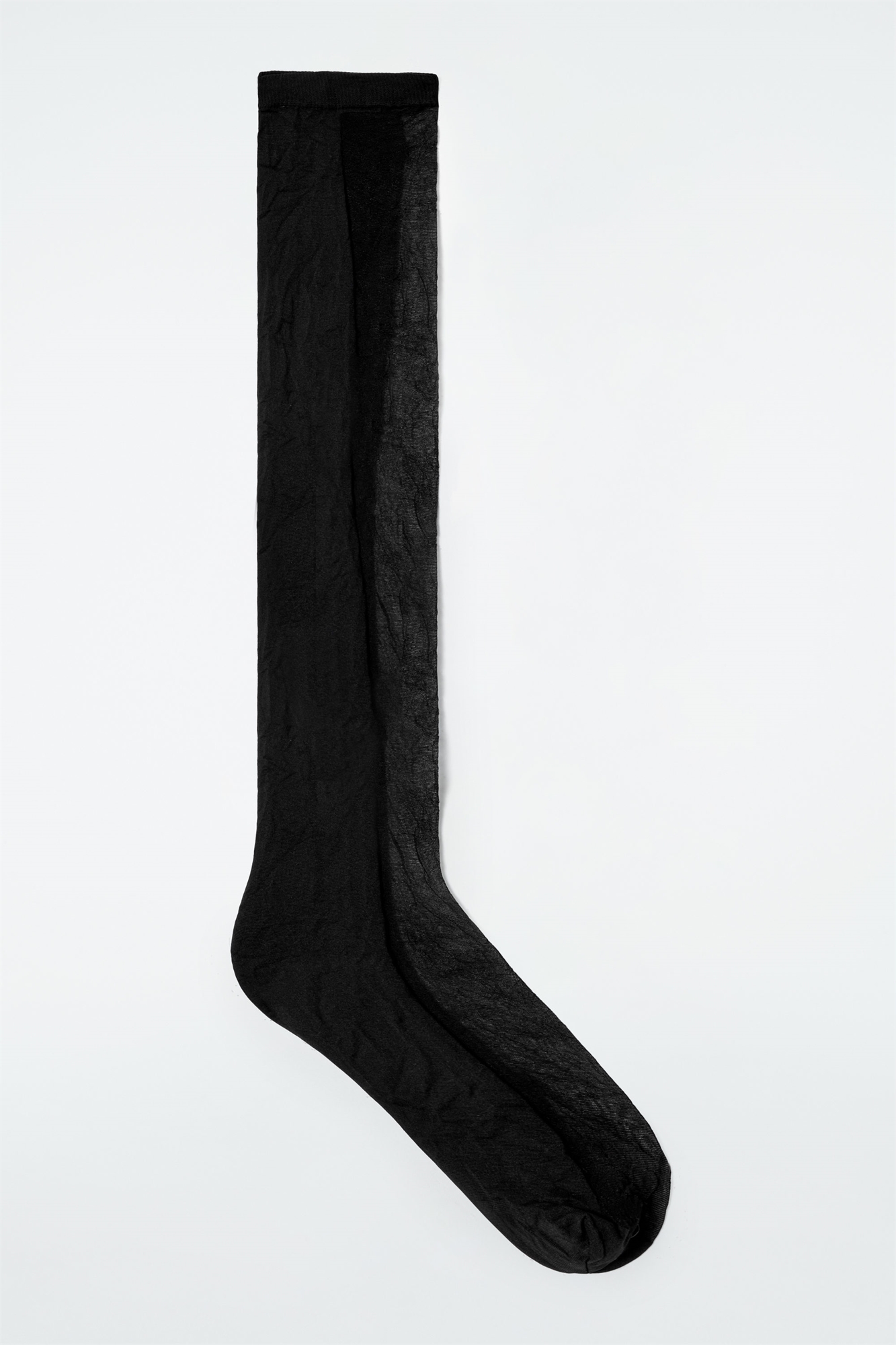 Эти носки до колена - изящный способ приобщиться к тренду на гладкость. Они выполнены в строгом черном цвете, имеют прозрачную вставку и ребристые манжеты, которые не сползают вниз. Носите их с лоферами или балетками. Усиленные мыски Материал: 94% полиамид (нейлон), 6% эластан. Без учета отделки / Машинная стирка