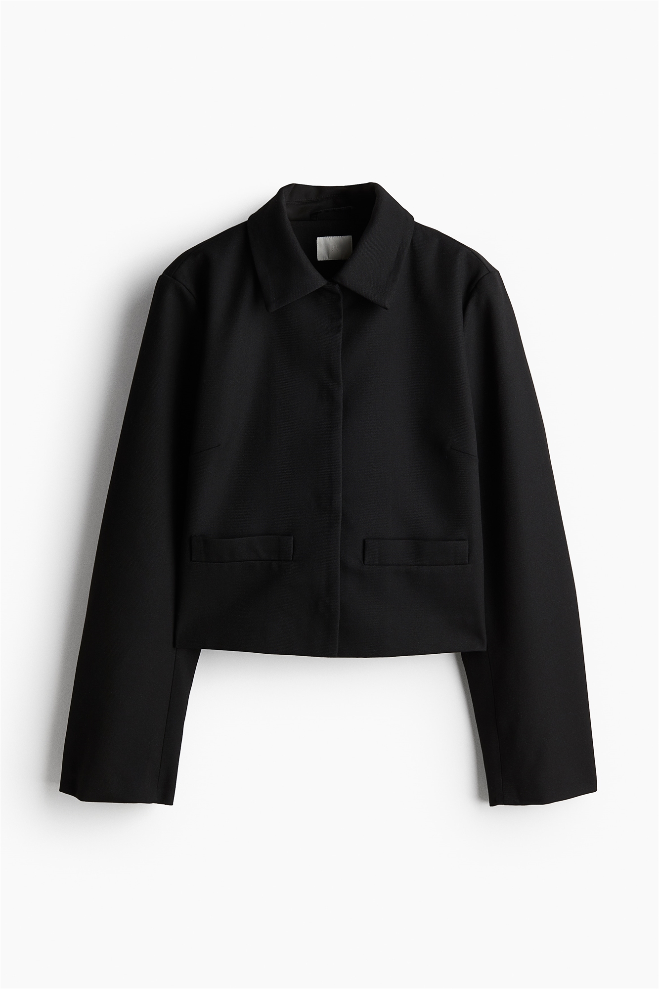 Короткий жакет с воротником, слегка спущенными плечами, длинными рукавами и втачными карманами спереди. На подкладке.
