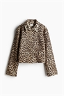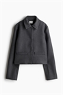 Короткий жакет с воротником, слегка спущенными плечами, длинными рукавами и втачными карманами спереди. На подкладке.