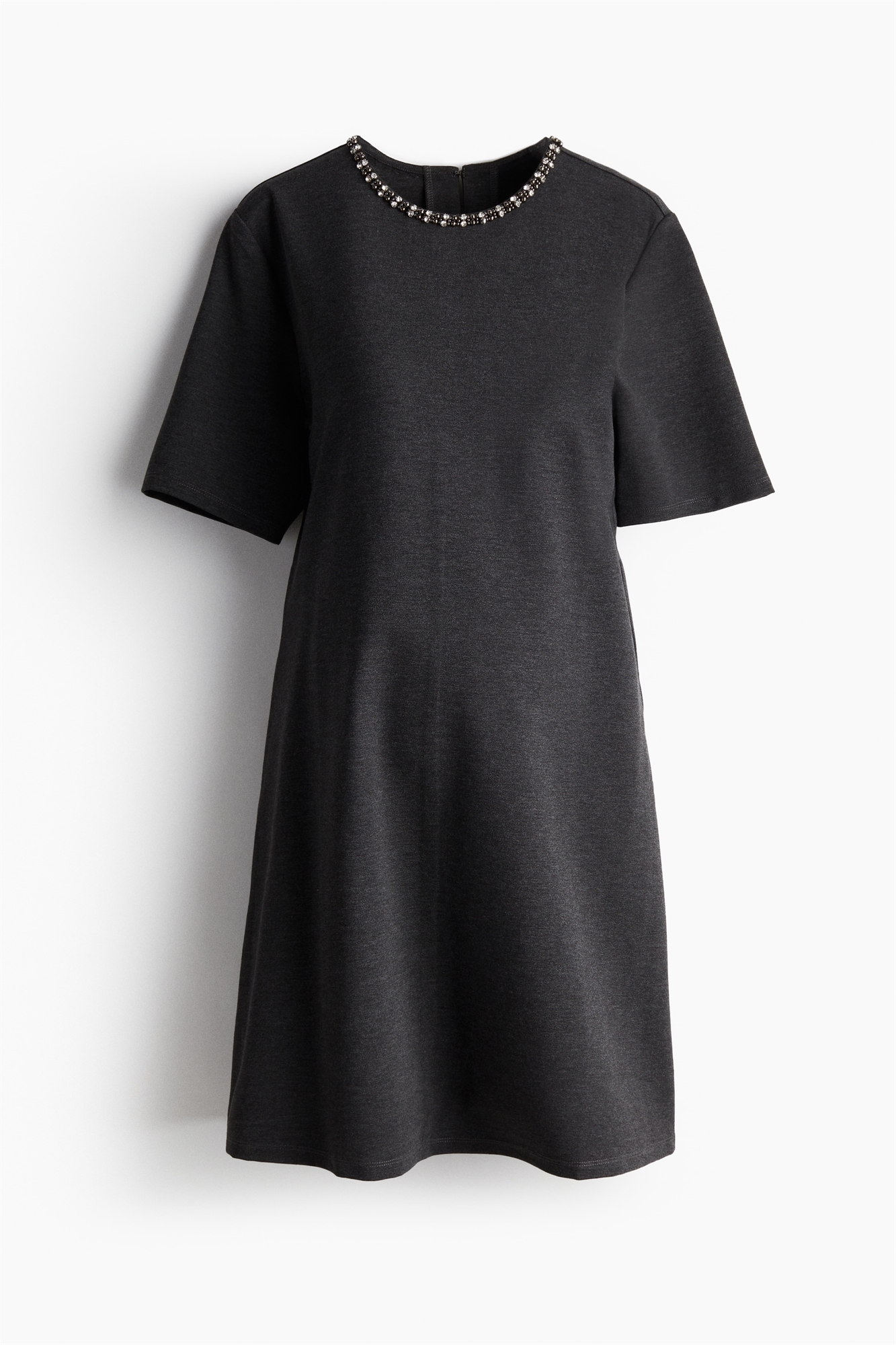 Короткое платье свободного покроя из плотного джерси с силуэтом А-линия. Круглый вырез украшен блестящими бусинами и стразами разного дизайна и размера. Короткие рукава и застежка-крючок сзади на шее.