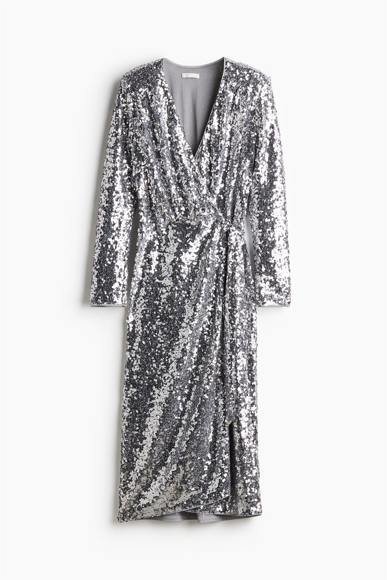 Платье длиной до колена из блестящей сетки с V-образным вырезом горловины и облегающим передом с потайной застежкой на крючки и глазки, широкими завязками с одной стороны и узкими потайными завязками с другой. Собранные, направленные вперед плечевые швы, подплечники и длинные рукава. Узкая эластичная резинка сзади на талии. Подкладка из джерси.