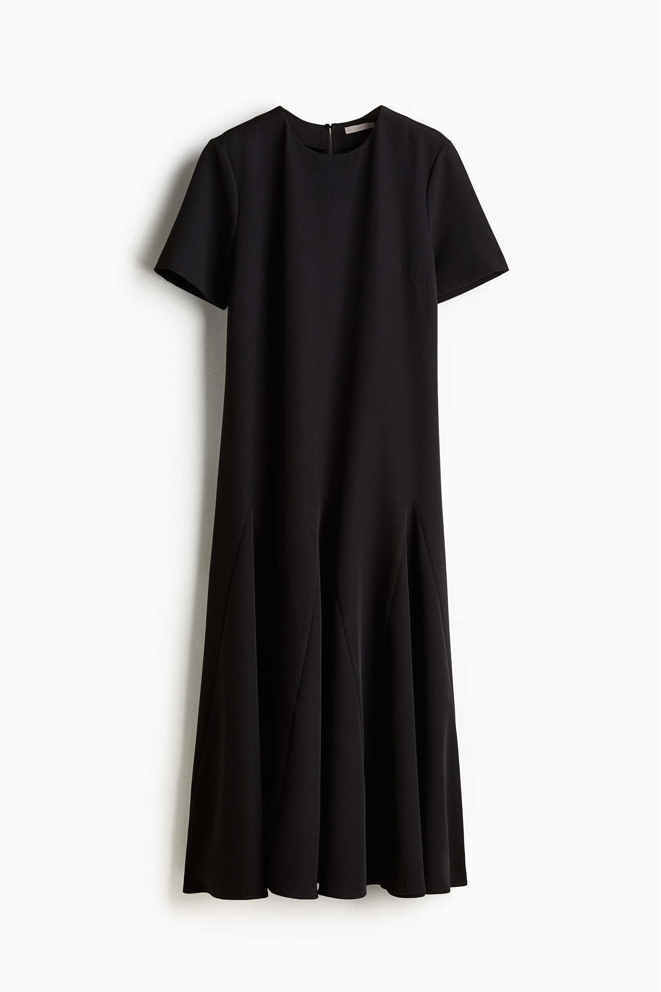 Платье длиной до колен из саржи с круглым вырезом и прорезью для ключа с потайной пуговицей сзади. Короткие рукава и расклешенная юбка со вставками для придания объема. Без подкладки.
