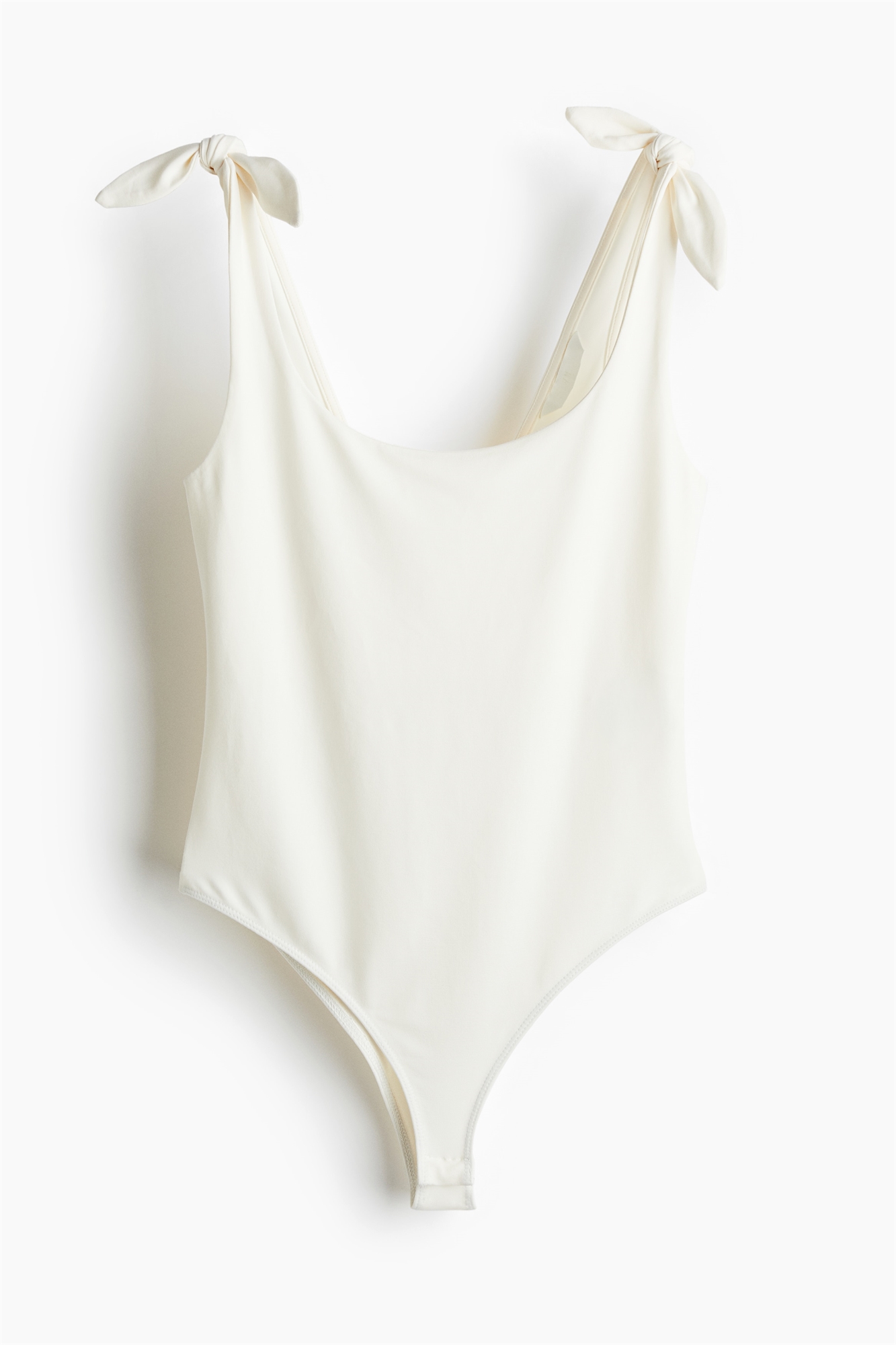 Боди из эластичного джерси с завязками на плечах и вырезом-лодочкой спереди и сзади. Скрытые кнопки в промежности и вырез сзади. Частично на подкладке.