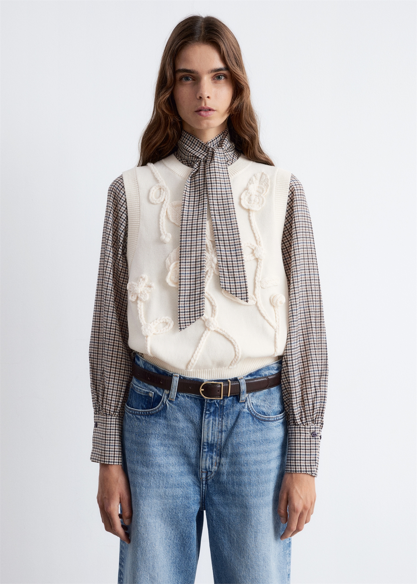 Вязаный жилет с ребристой отделкой по вырезу горловины, рукавам и подолу. Спереди украшен вязаной цветочной аппликацией. • Regular fit • Без рукавов Длина жилета: 54,5 см / 21,4" (размер S)