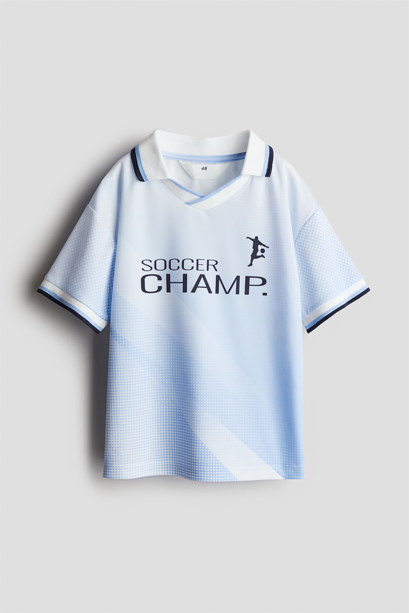 Футбольная рубашка из набивной сетчатой ткани с ребристым воротником и V-образным вырезом горловины. Короткие рукава с манжетами в рубчик.