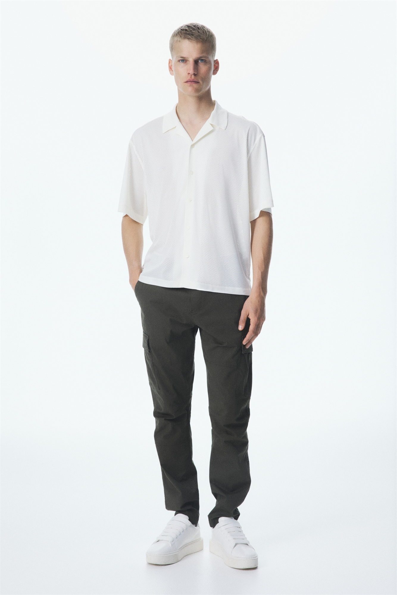 Брюки из хлопчатобумажной ткани с эластичной отделкой и утягивающим шнурком на талии, фальшивая ширинка, диагональные боковые карманы и накладные задние и ножные карманы со скрытыми кнопками. Зауженные ноги со швами и вытачками на коленях. Зауженный крой, облегающий контуры тела и создающий приталенный силуэт.