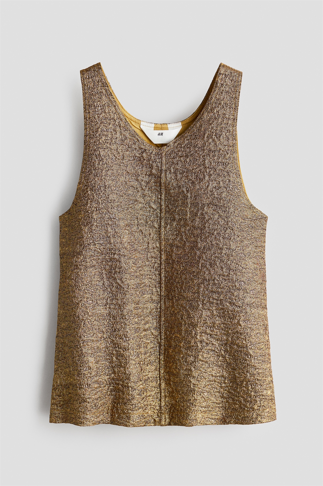 Платье без рукавов из жаккардового переплетения с металлическим отливом, V-образным вырезом и вертикальным швом спереди. Подкладка из тафты.