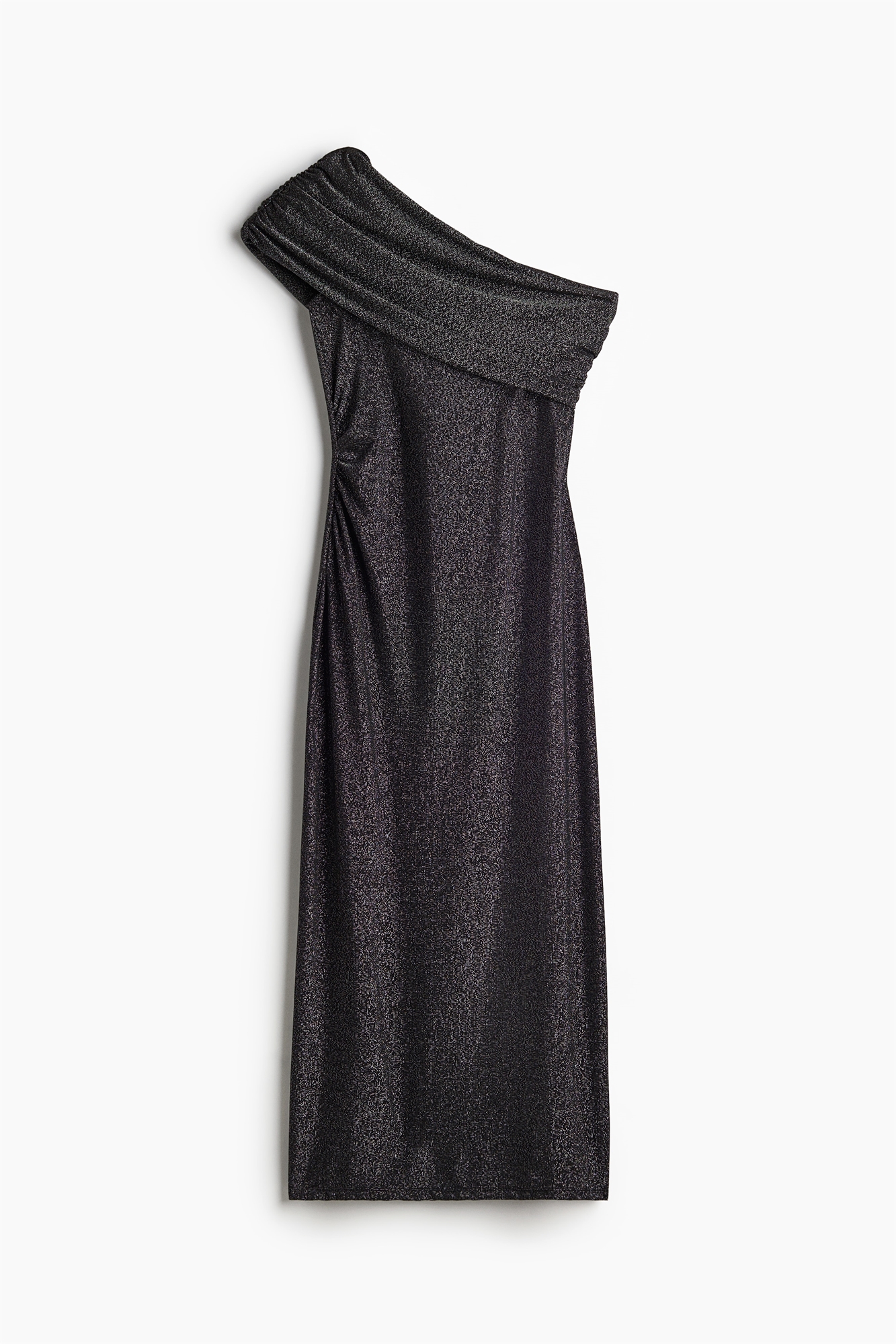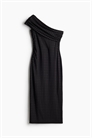 Приталенное платье из джерси с асимметричным вырезом на одно плечо, широкой драпированной складкой в верхней части и сборкой на талии с одной стороны для придания силуэту стройности.