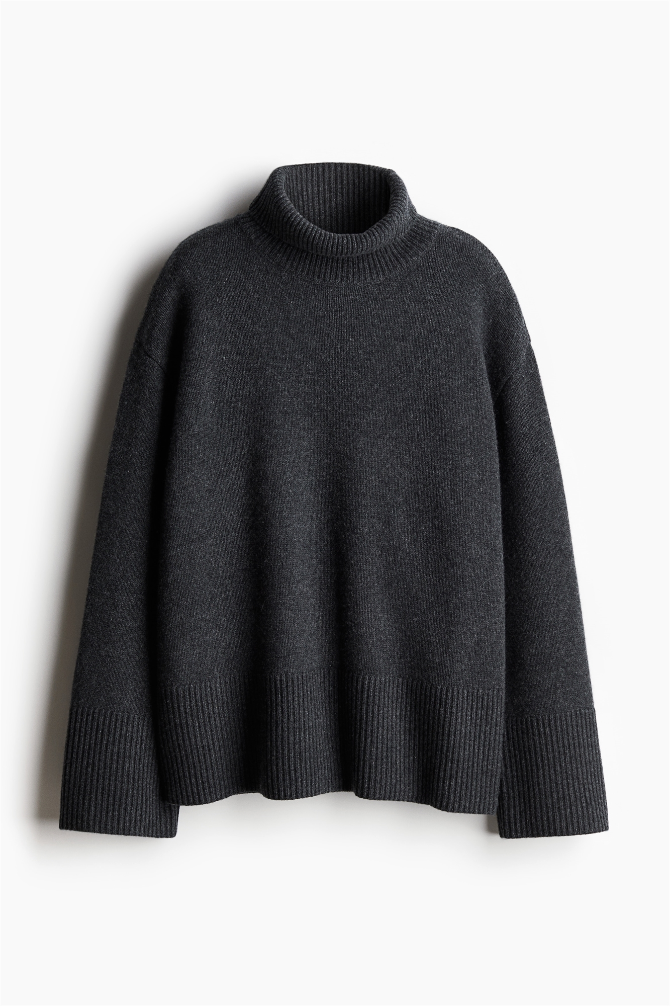 Джемпер большого размера из мягкого трикотажа, выполненного из смеси кашемира и шерсти. Ребристая горловина-поло, спущенные плечи и длинные рукава. Манжеты и подол отделаны широкой тесьмой.