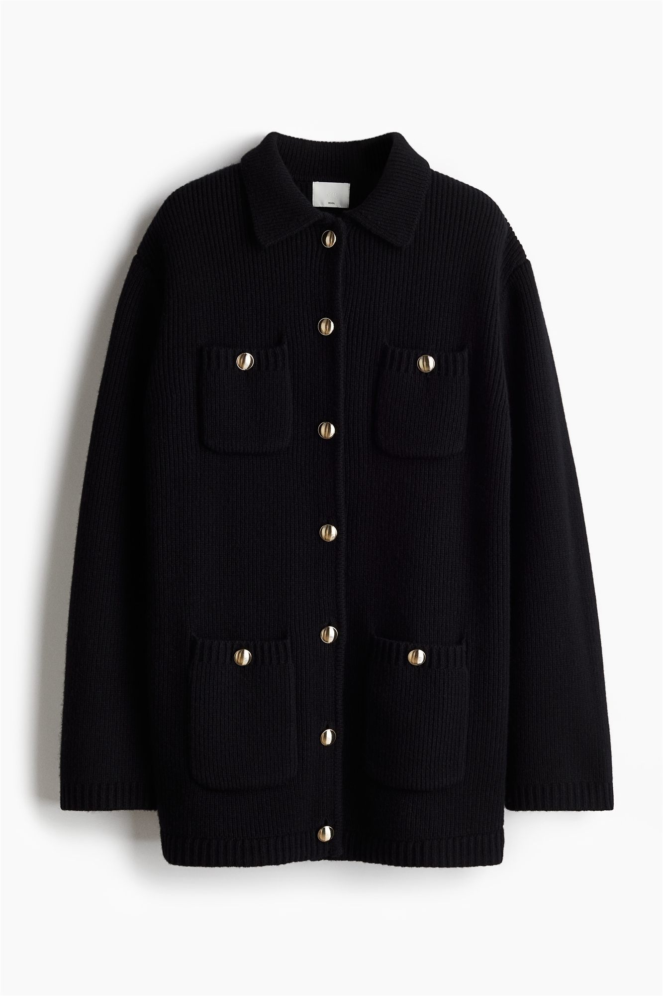 Длинный свободный кардиган из шерсти ребристой вязки с воротником, пуговицами золотистого цвета спереди, слегка спущенными плечами и длинными рукавами. Накладные карманы с пуговицей на груди и спереди.