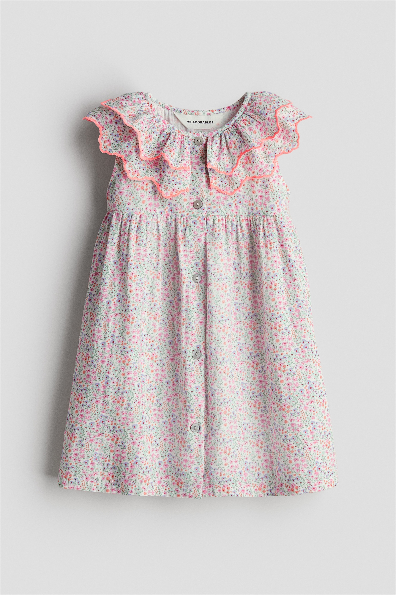 H&M Adorables. Платье без рукавов из мягкого муслина, изготовленного из высококачественного хлопка. Двухслойный воротник с оборками, обработанный оверлоком, и мерцающие перламутровые пуговицы спереди. Сборчатый шов в верхней части и расклешенная, объемная юбка. Без подкладки. Коллекция H&M Adorables - это подборка удобных и качественных вещей, не теряющих актуальности.