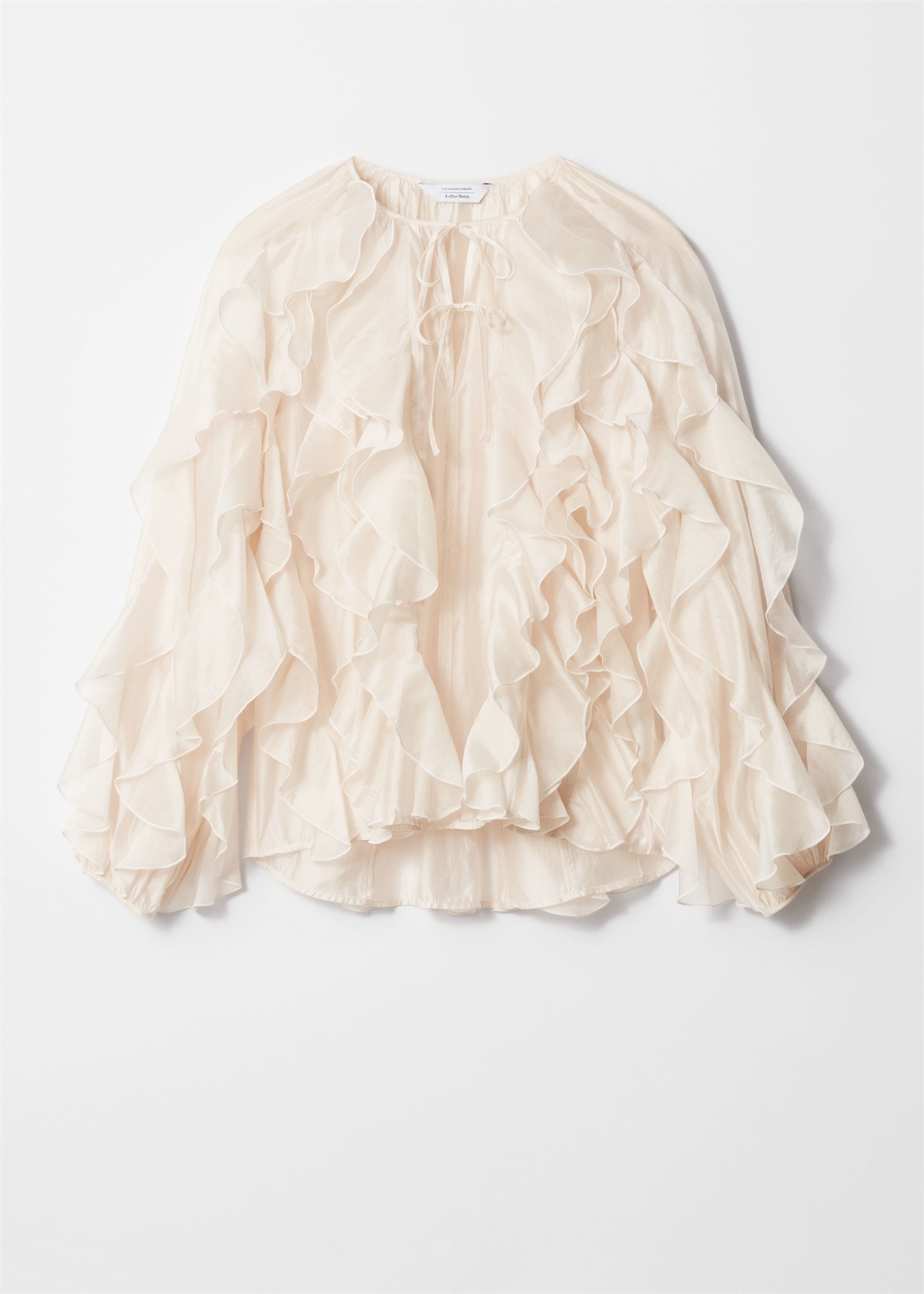 Блузка с длинными рукавами, украшенная каскадными оборками. Отделанная V-образным вырезом горловины с завязками. Длина блузки: 66,5 см / 26,2" (размер S)
