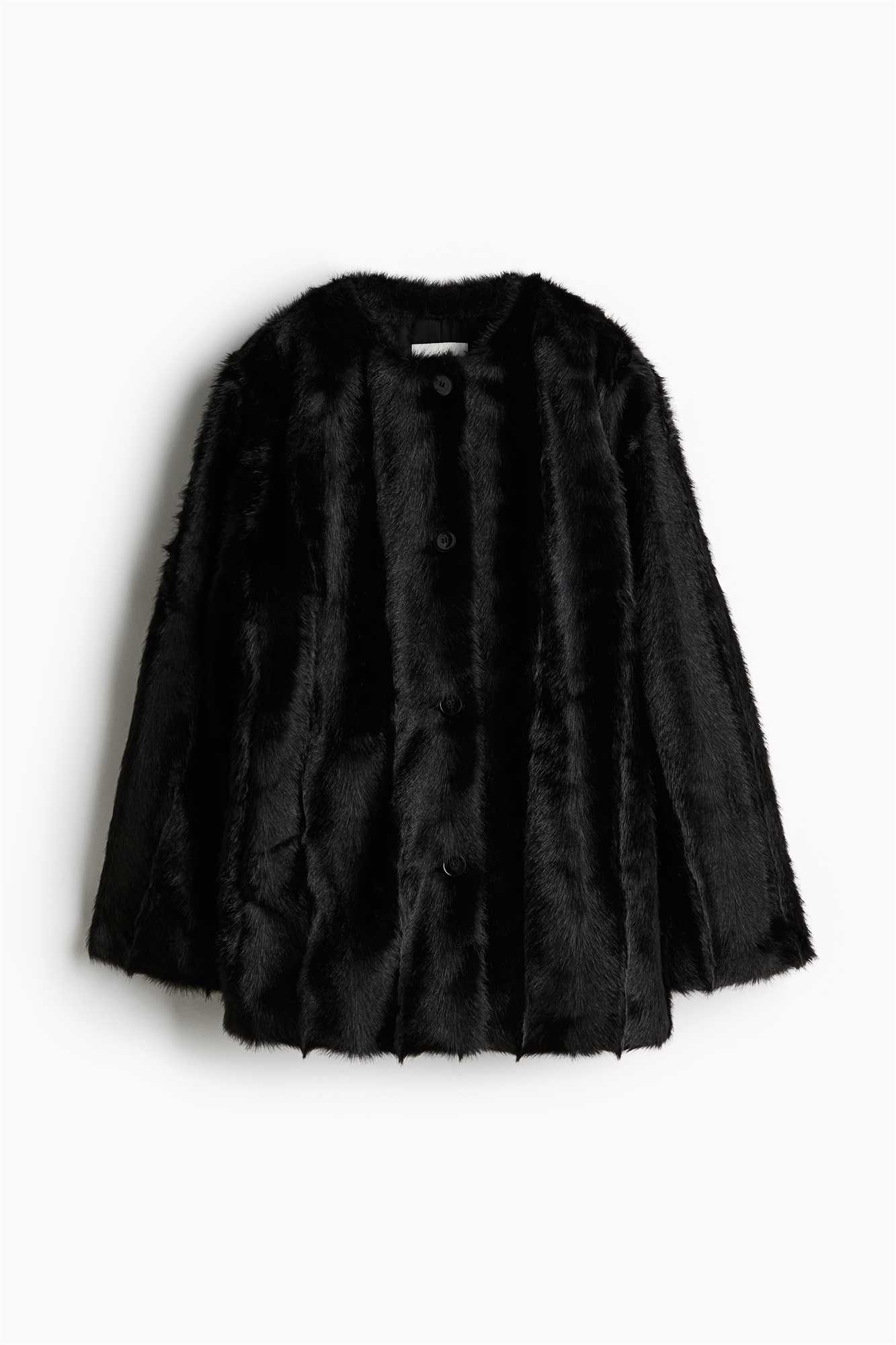 Жакет из пушистой ткани с круглым вырезом, застежкой на пуговицы спереди и незаметными карманами в боковых швах. На подкладке.