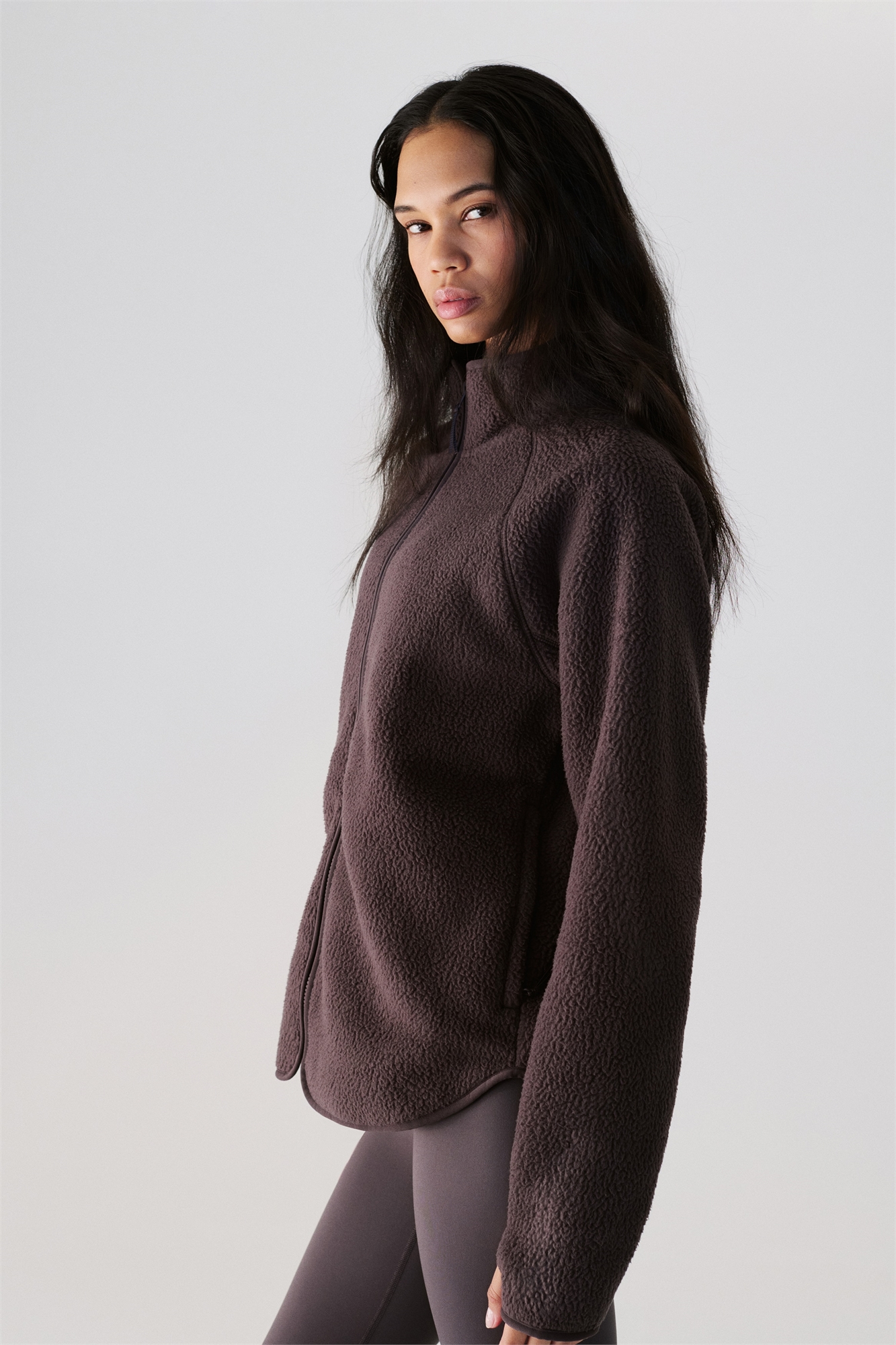 Спортивная куртка из мягкого, согревающего тедди. Регулярный крой с воротником-стойкой и застежкой-молнией спереди. Удлиненные рукава реглан с отверстиями для больших пальцев на манжетах. Карманы на молнии по бокам. Закругленный подол и эластичная резинка на манжетах и подоле. Удлиненный сзади.