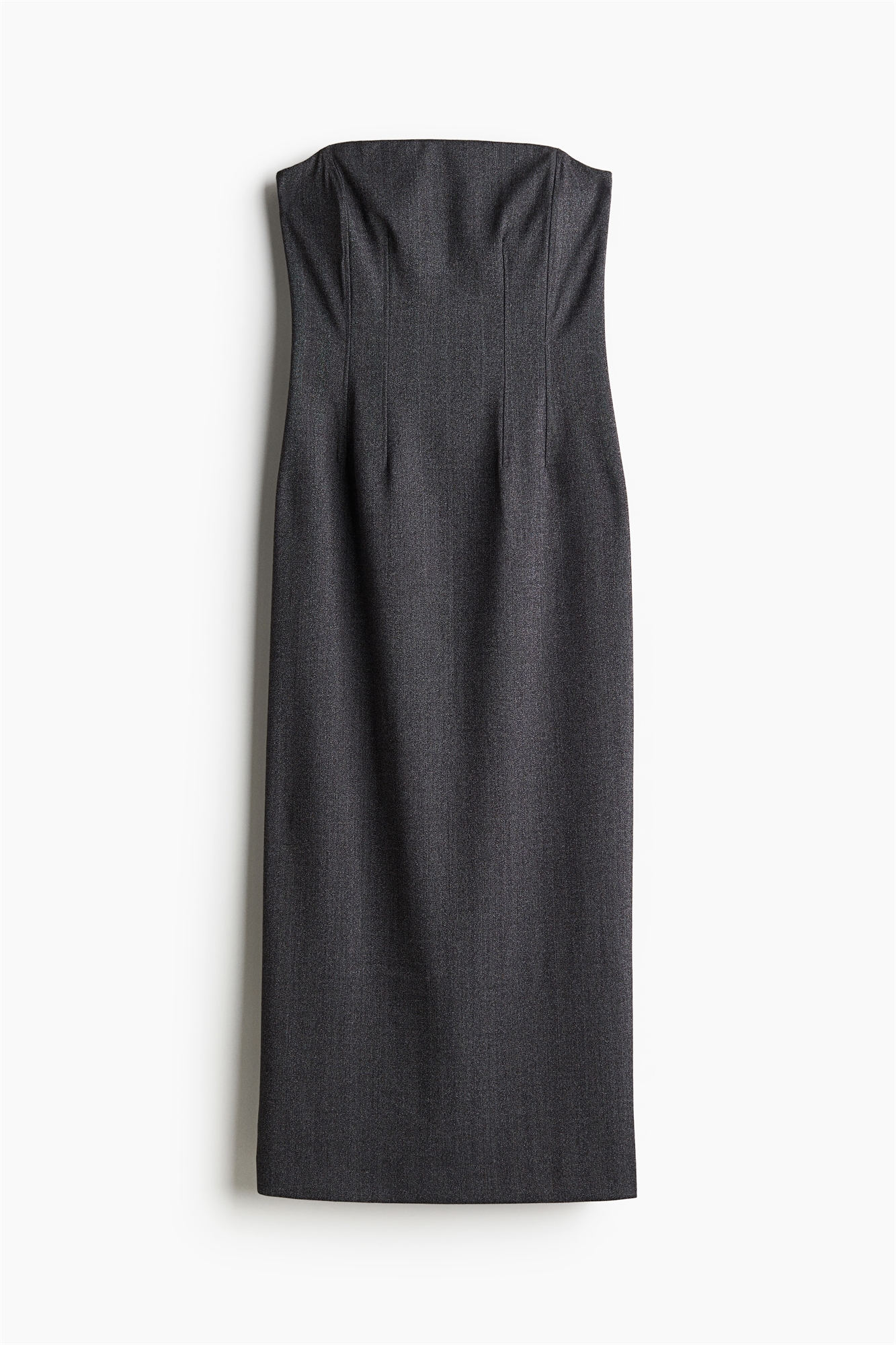 Приталенное платье-бандо длиной до колен из тканого материала со скрытой силиконовой отделкой в верхней части и скрытой застежкой на молнию и крючок-глаз сзади. Бонирование спереди и сзади для придания формы и поддержки. Одиночная вентиляция на спине. На подкладке.