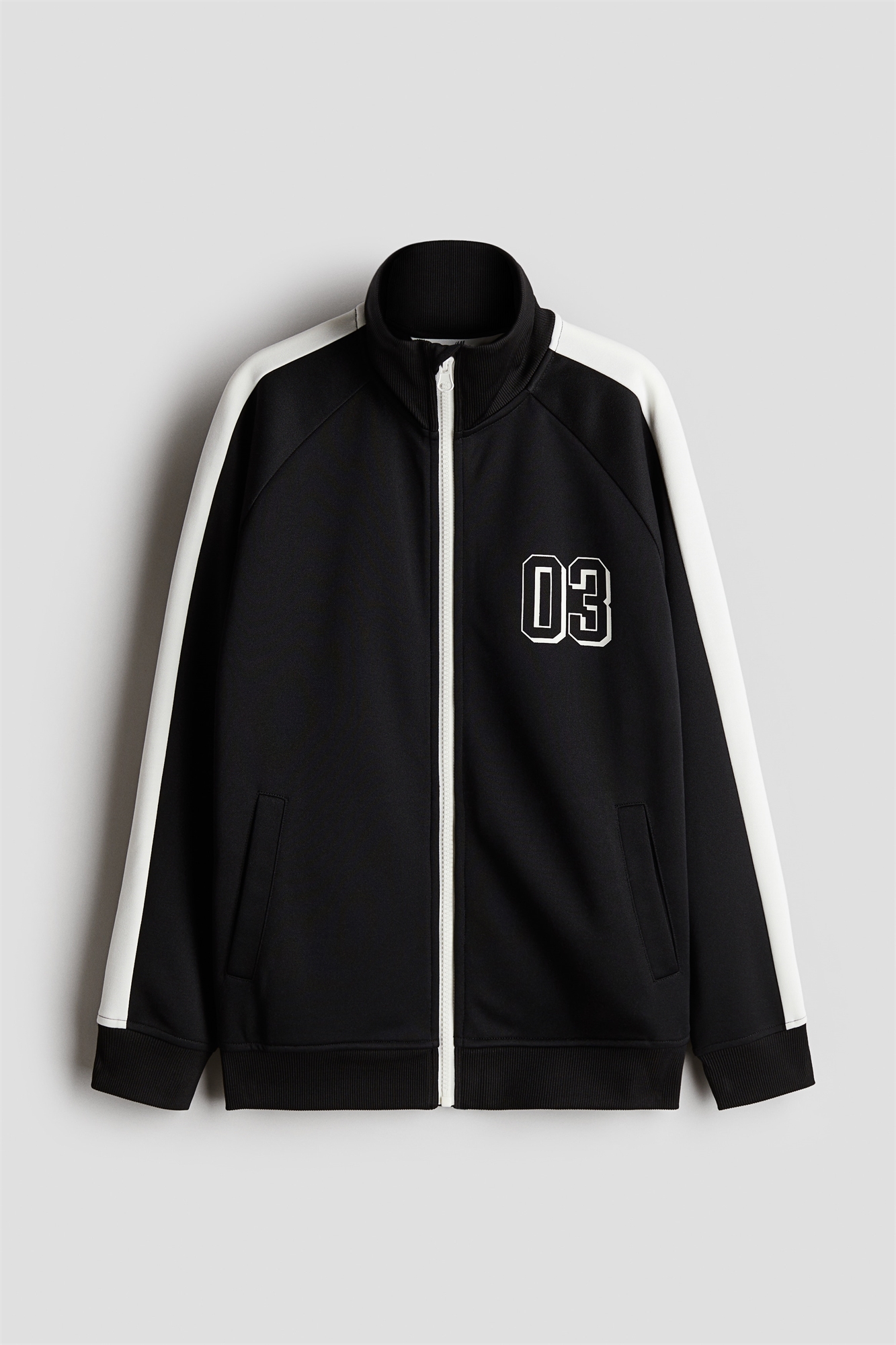 Спортивная куртка из плотного трикотажа с начесом внутри и легким блеском с принтом на груди. Детали контрастного цвета, воротник-стойка, застежка-молния спереди с защитой подбородка от натирания и длинные рукава. Манжеты и подол обработаны ребрами жесткости.