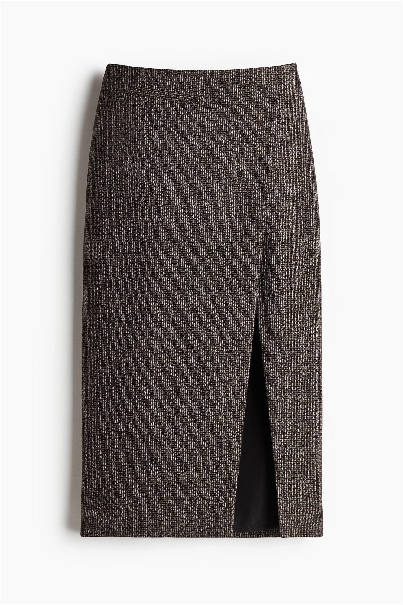 Юбка длиной до колена из тканого материала с асимметричным передом и потайными пуговицами. Накладной карман спереди и прямой подол с разрезом спереди. На подкладке.