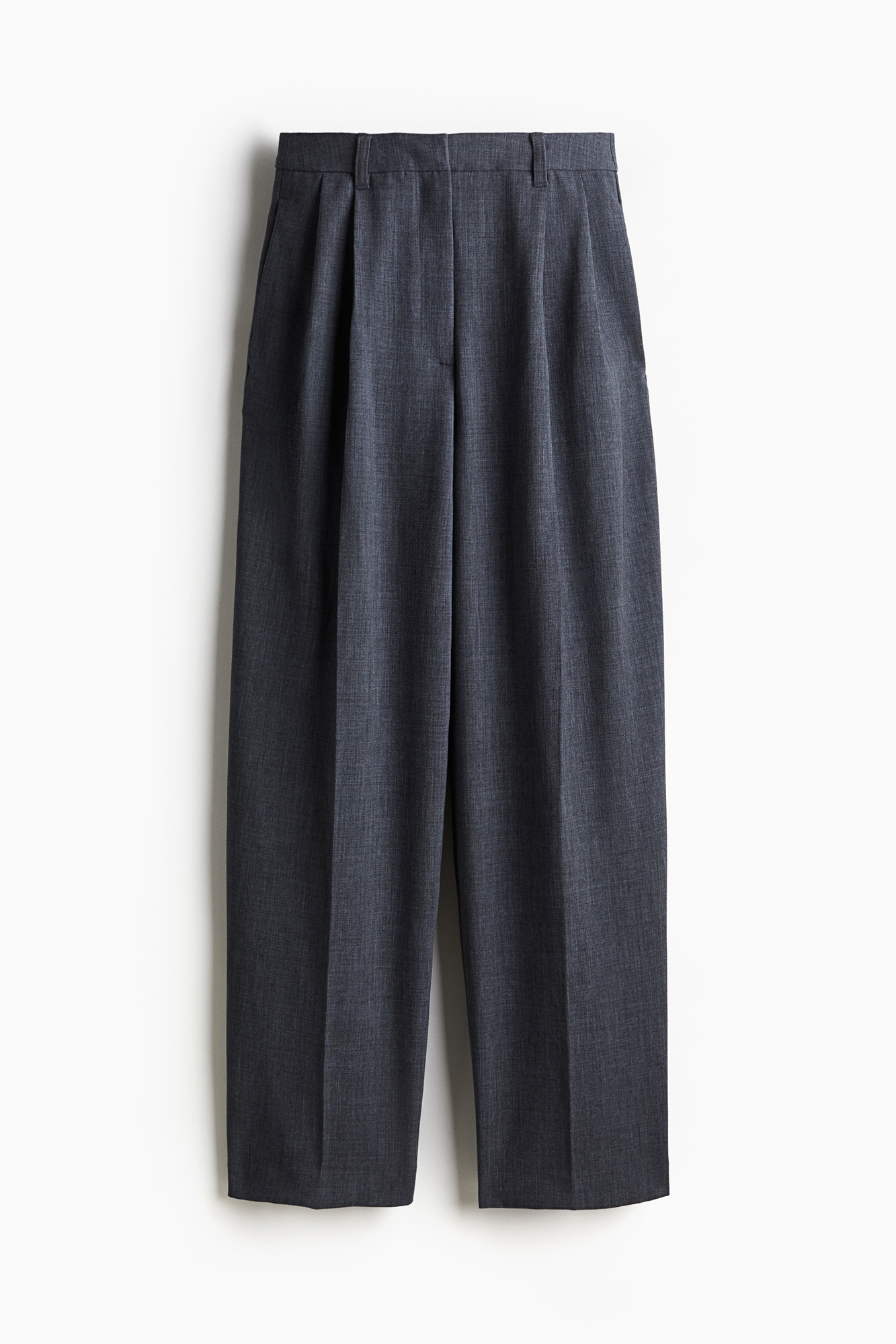 Приталенные брюки свободного кроя из тканого материала. Высокая талия, ширинка на молнии, потайная застежка на пуговицах и крючках. Небрежные боковые карманы, втачные задние карманы и удлиненные штанины со складками спереди и складками спереди и сзади.