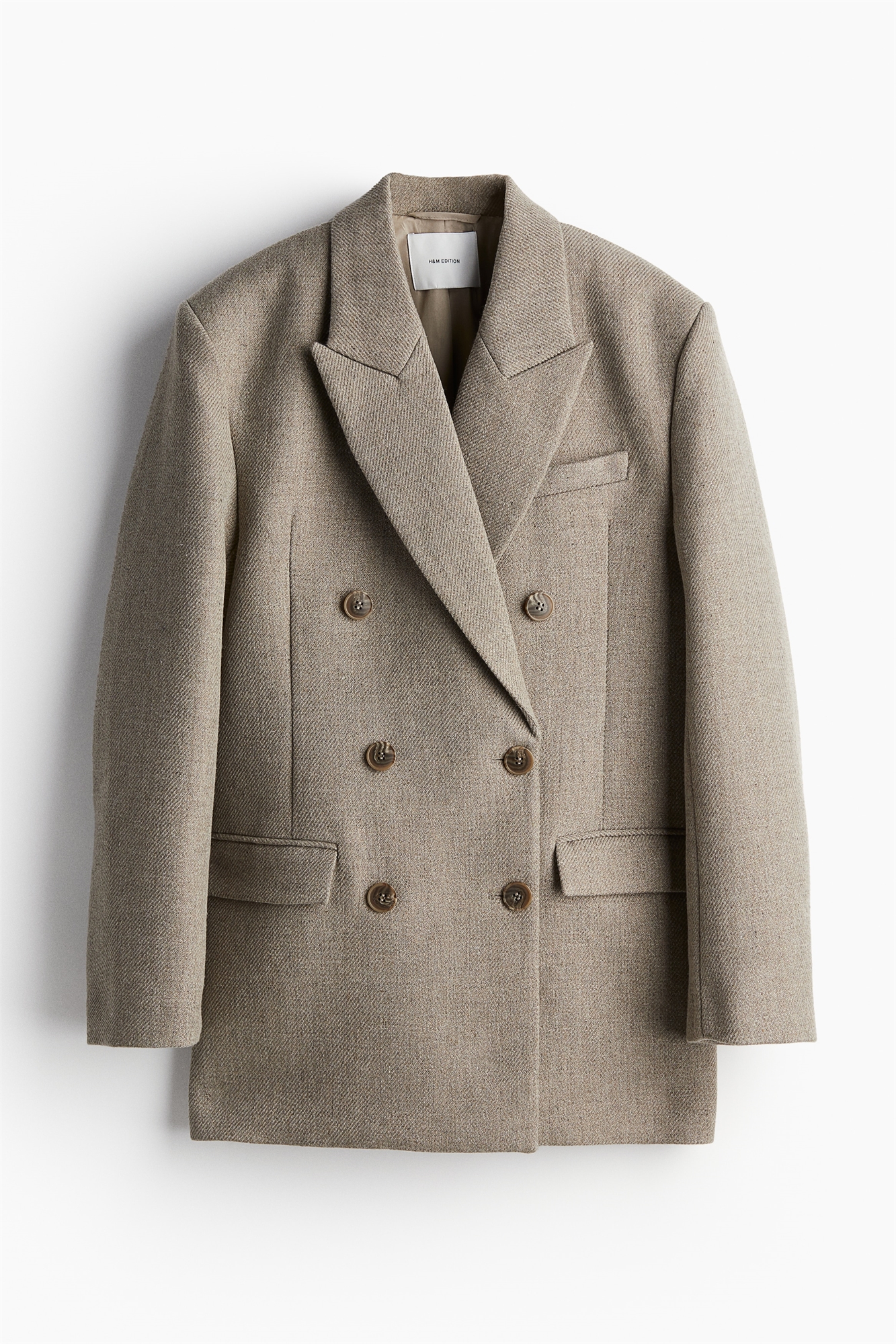 Двубортный блейзер из ткани с содержанием шерсти в стиле оверсайз. Лацканы с отворотами и подбитые плечи. Накладной карман на груди, накладные карманы спереди и внутренний карман с отделкой. На подкладке.