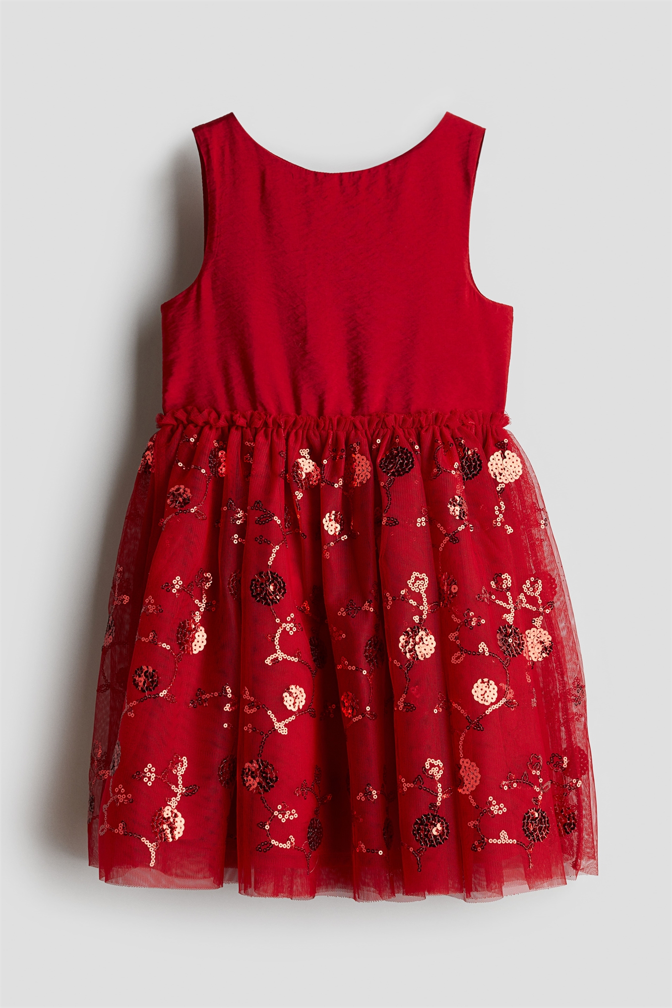 Платье без рукавов из тканого материала с легким блеском. Круглый вырез, застежка на пуговицы сзади, сборчатый шов на талии и расклешенная юбка из тюля с блестками. На подкладке.