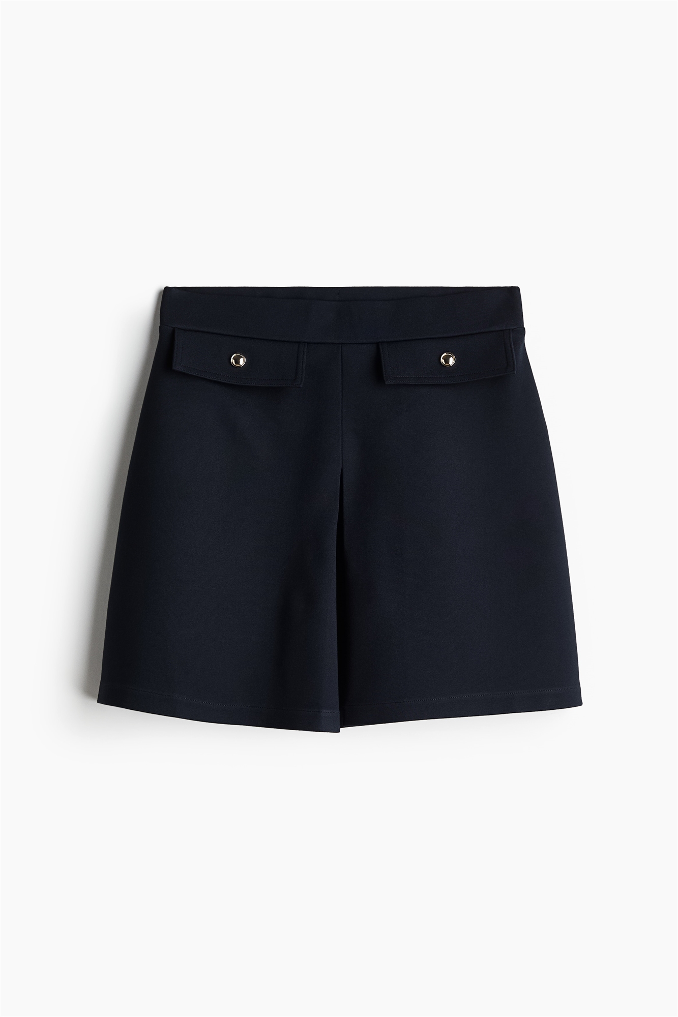 Короткая юбка А-линии из джерси с высокой эластичной талией, декоративными клапанами карманов с застежкой на кнопки и перевернутыми складками спереди для придания объема.