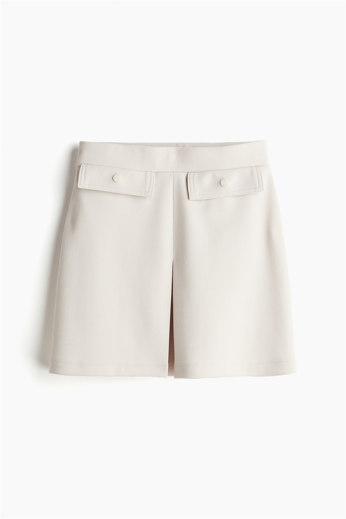 Короткая юбка А-линии из джерси с высокой эластичной талией, декоративными клапанами карманов с застежкой на кнопки и перевернутыми складками спереди для придания объема.